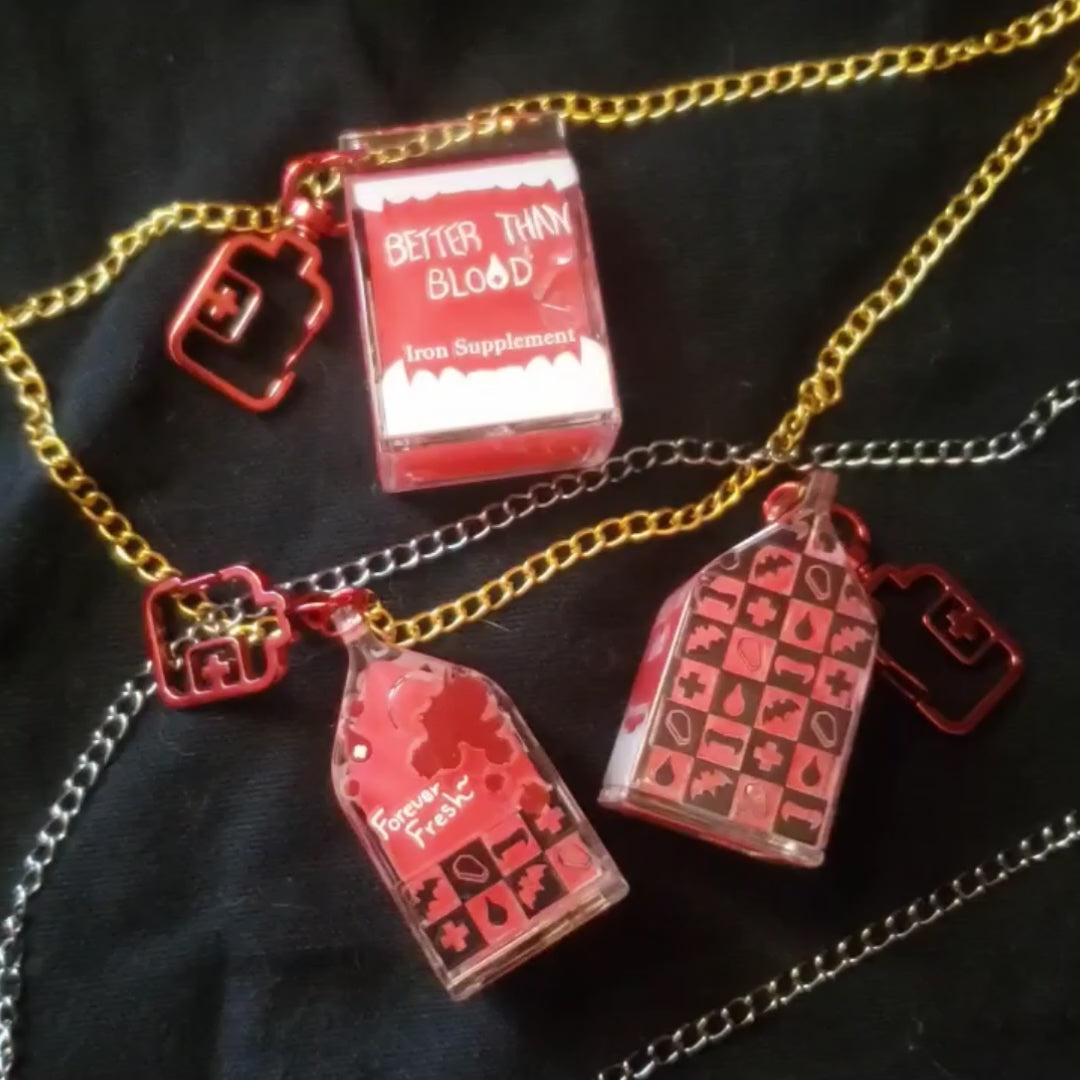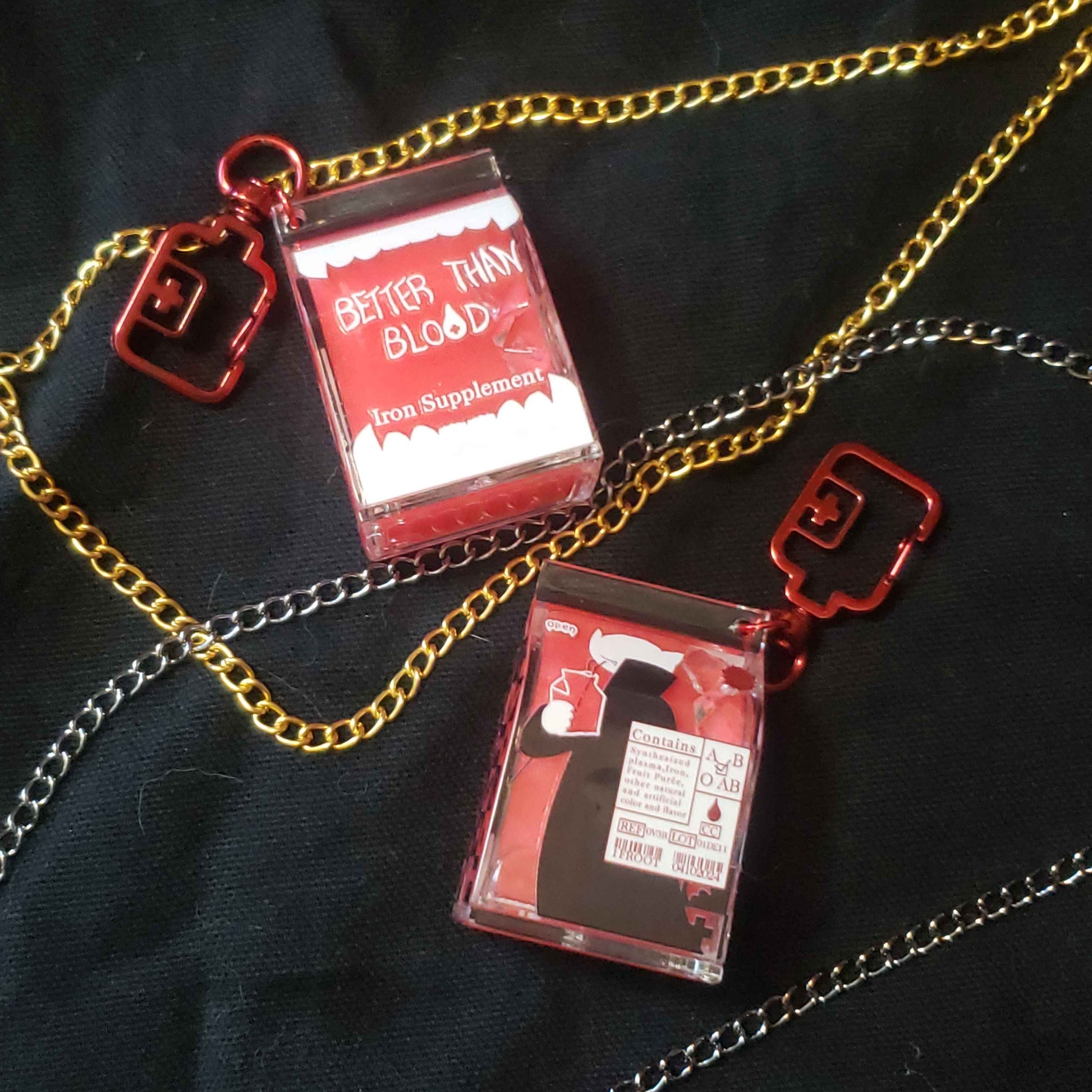 No need to bite a human again! Better Than Blood's most popular product, the blood carton is available now in charm form!