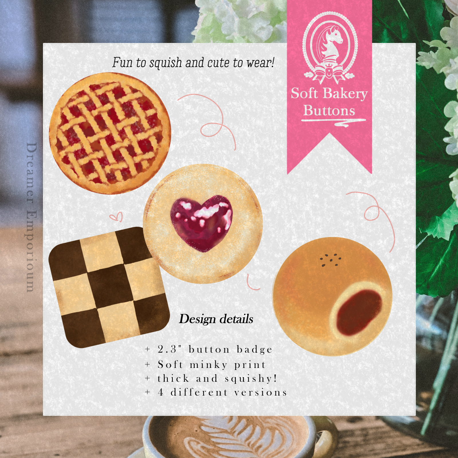 Fresh out of the oven! The sweet smell of sugar brings me back to warm days, and these soft fabric buttons are a cute way to wear simpler times. Plush padding makes these buttons cute and great to squish!