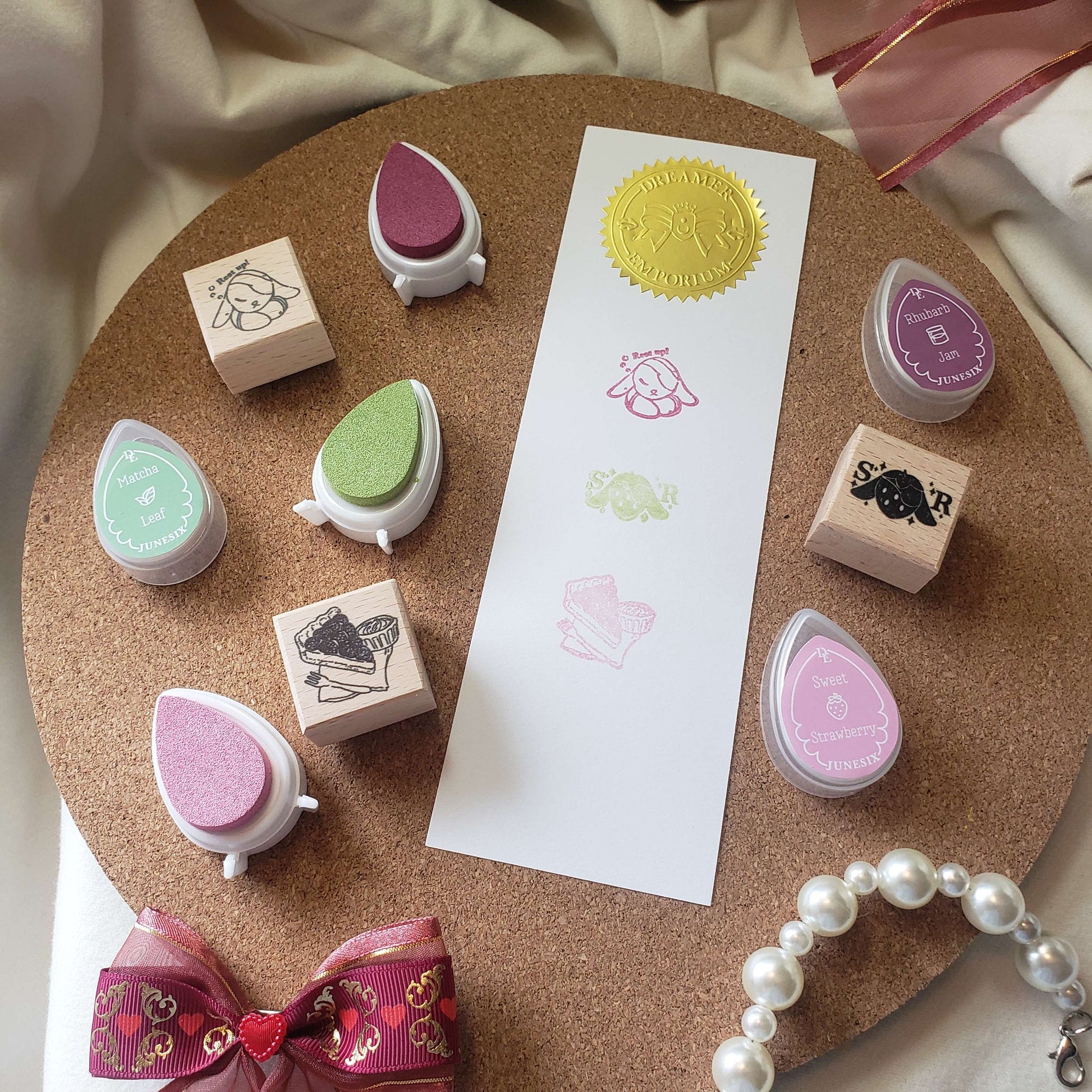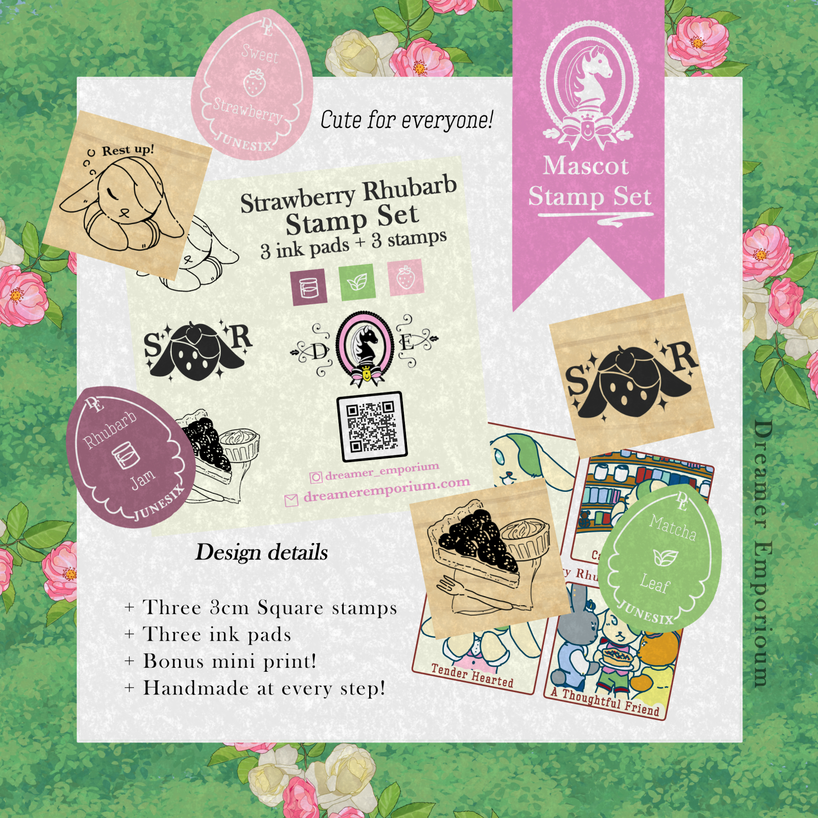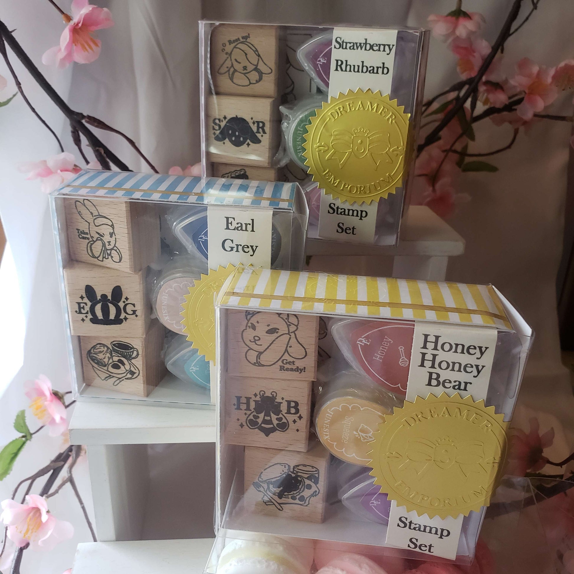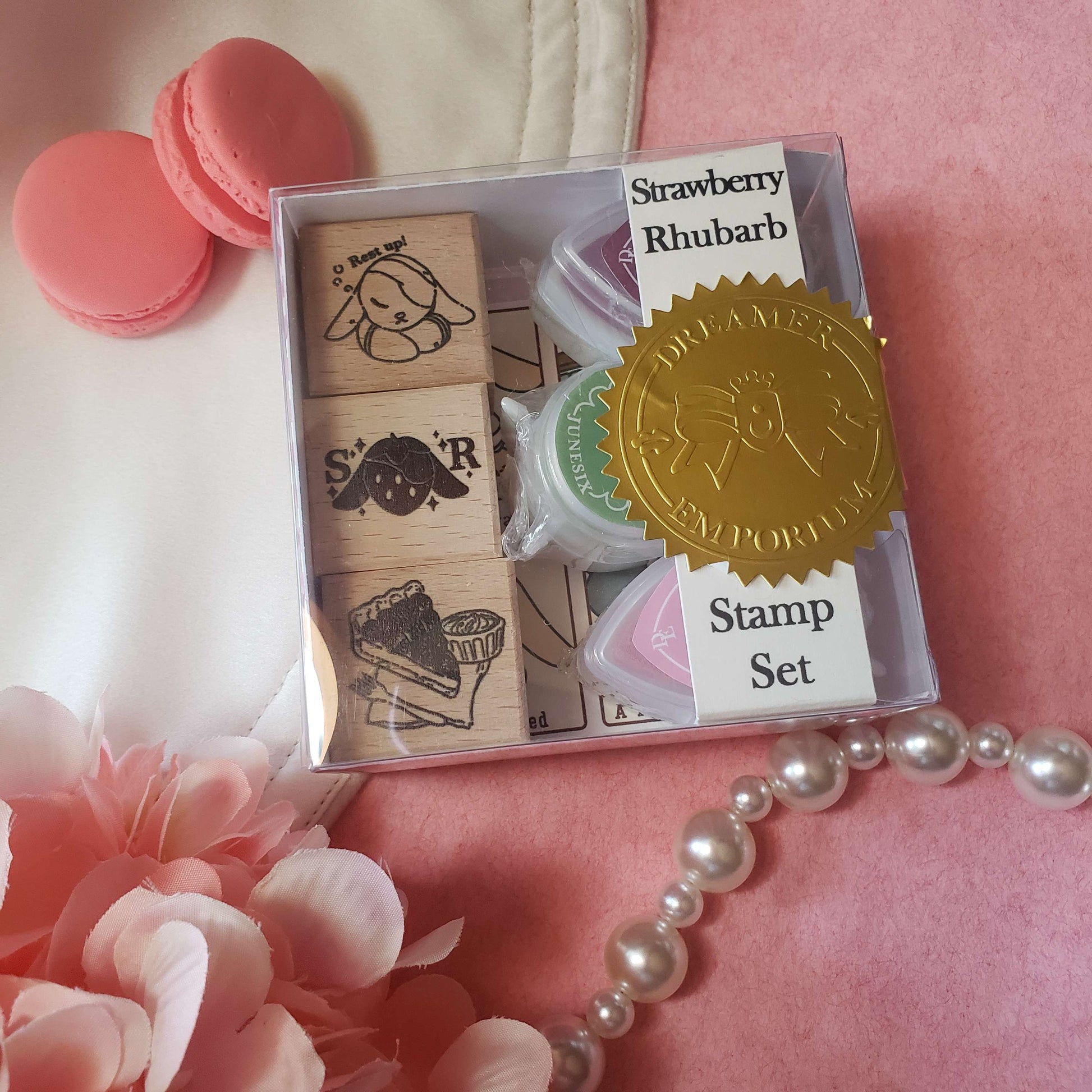 Great for journaling and crafts! These stamp sets for each of Strawberry Rhubarbs friends feature a favorite food, their signature, a reminder to be nice to yourself, and matching ink pads!
