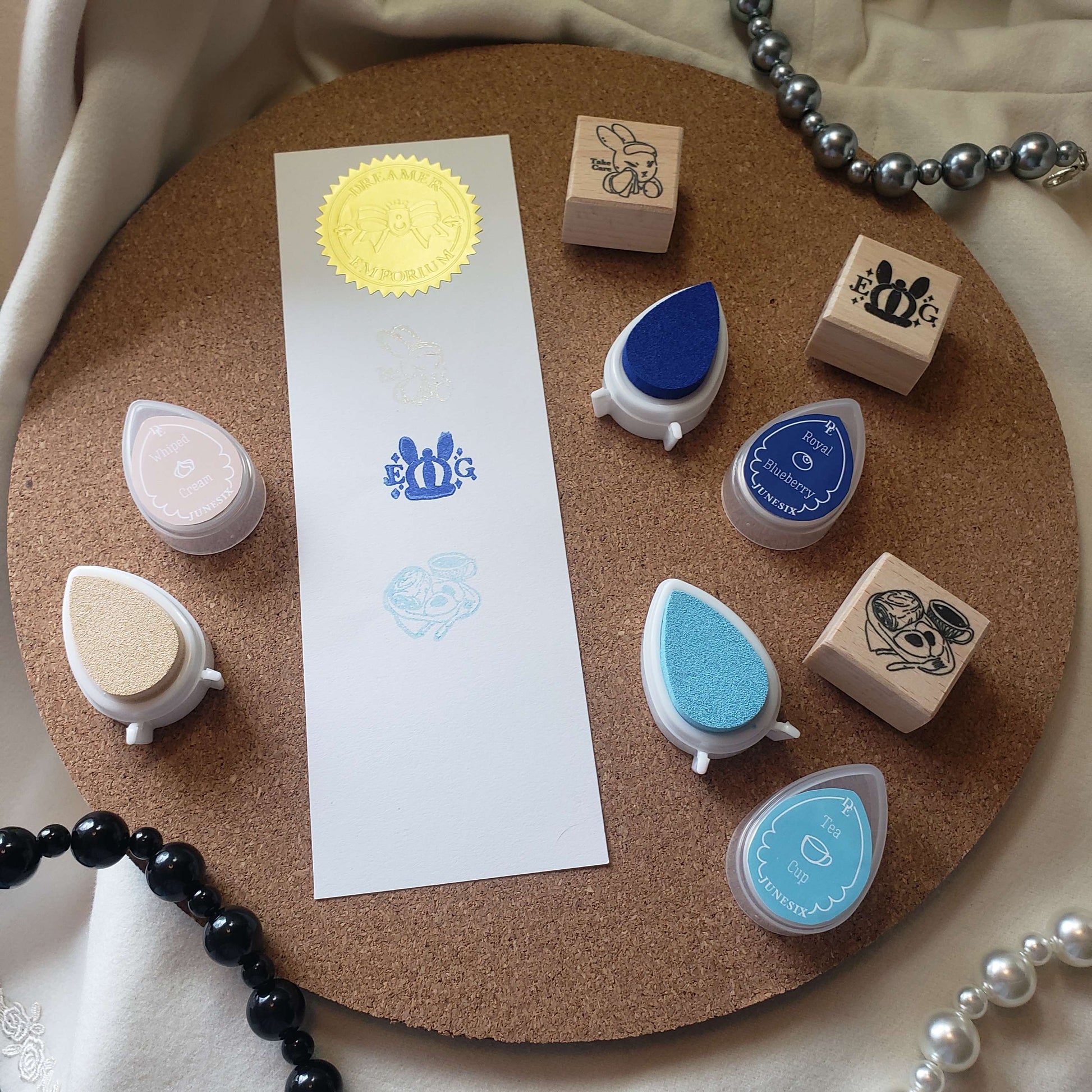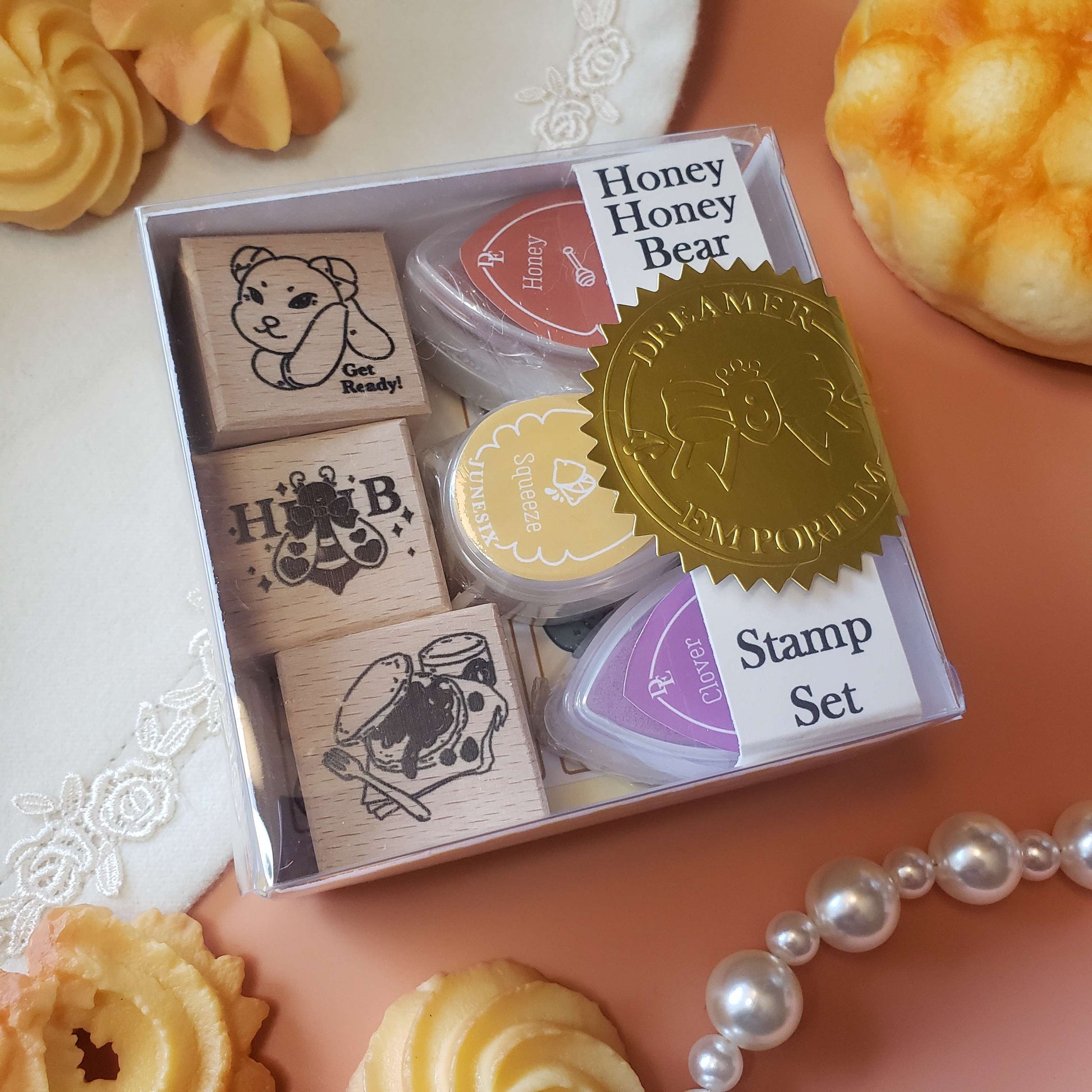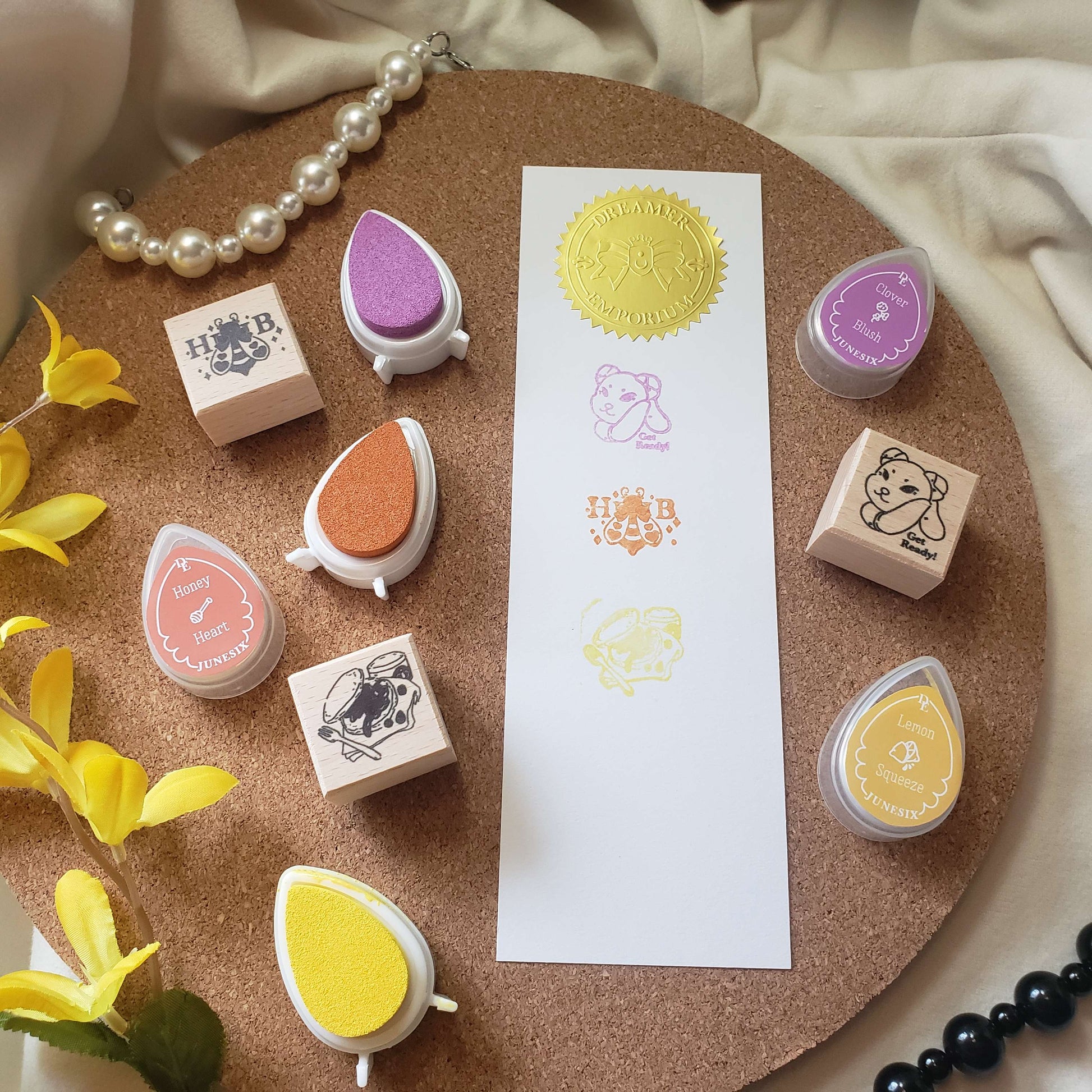 - Stamp sets come with three stamps, three ink pads, and a bonus mini print
