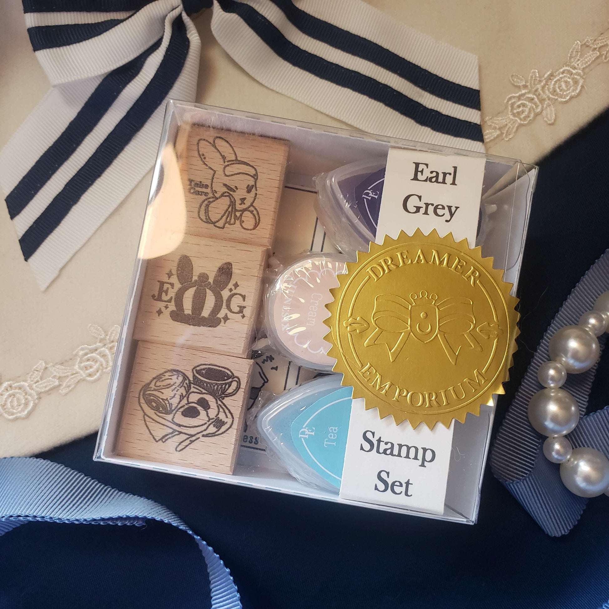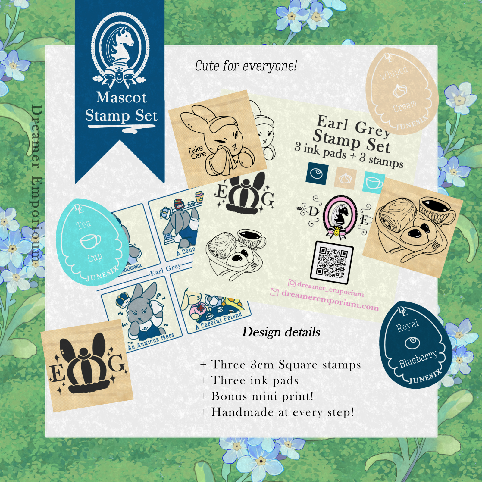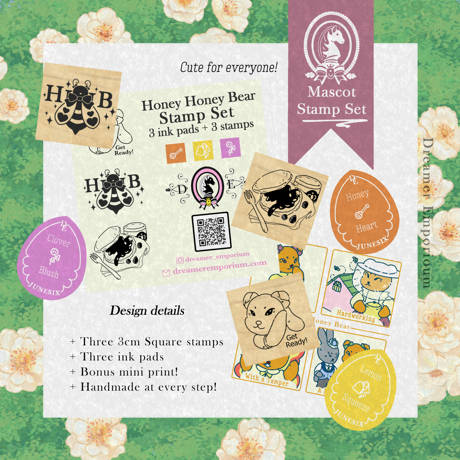 - Stamp sets come with three stamps, three ink pads, and a bonus mini print