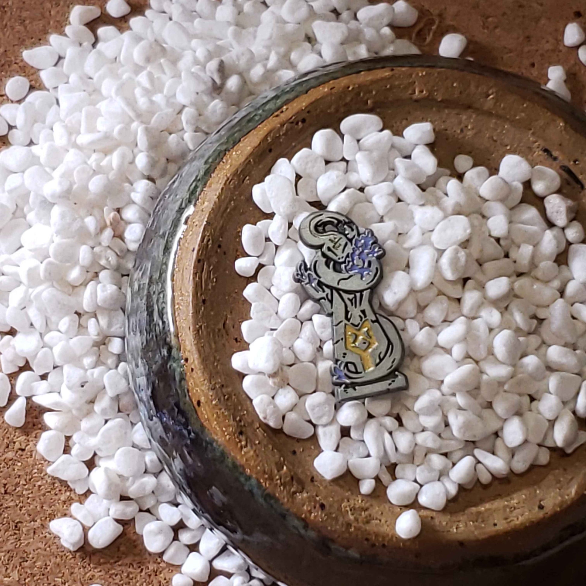 The great serpent now lies below- This statue enamel pin with pearl fill and antiqued silver metal finish, giving off a feeling of antiquity.