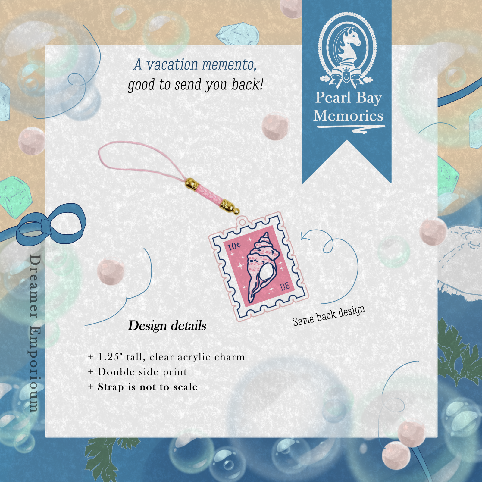 Doesn't it send you back? This charm featuring a stamp from the Pearl Bay post office is a small touch of that summer, with clear plastic and a double sided print.