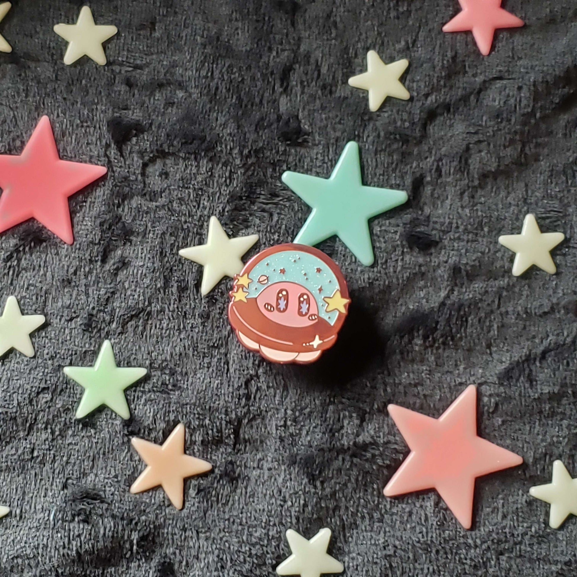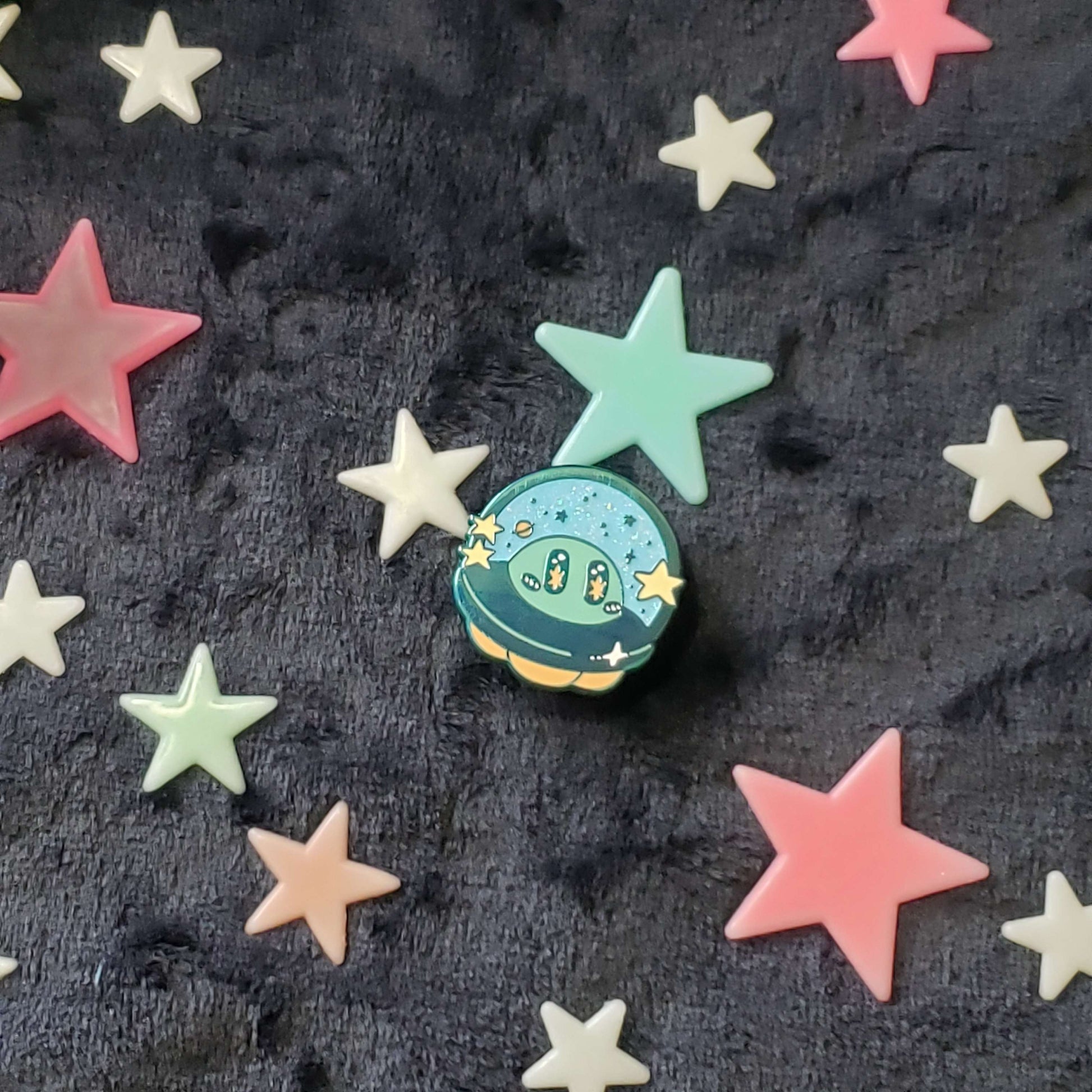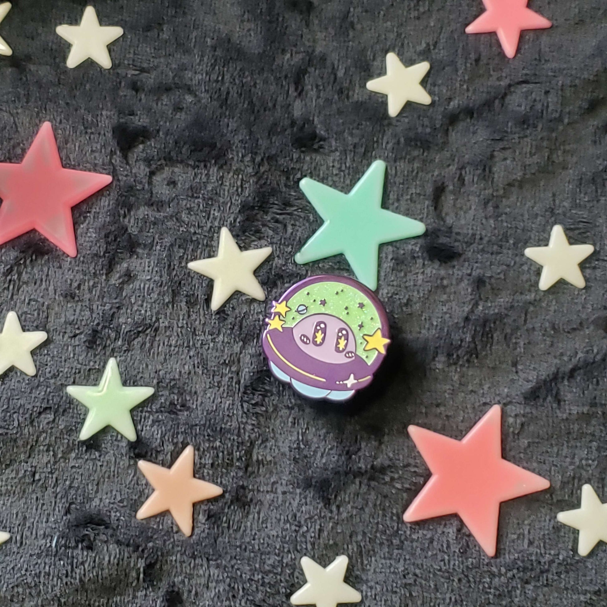 It's clear as the stars in his eyes, these pins are out of this world! These hard enamel pins have cool metal details and glitter filled skies!