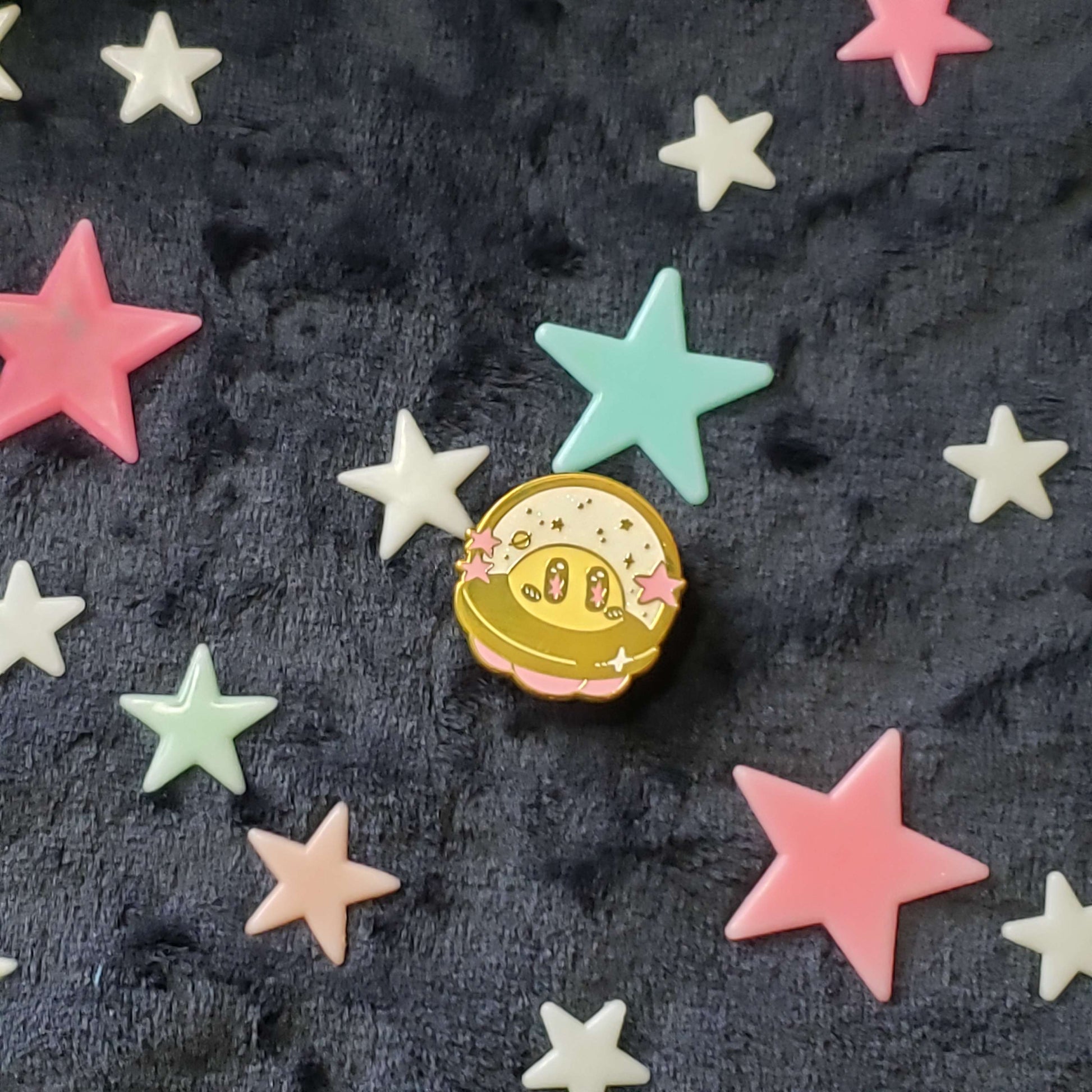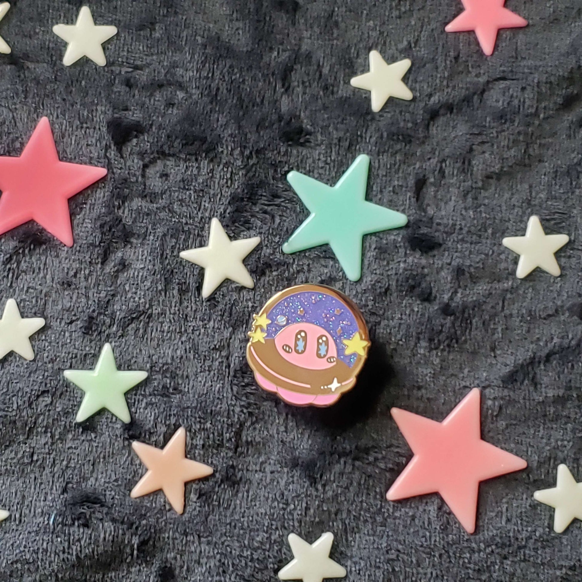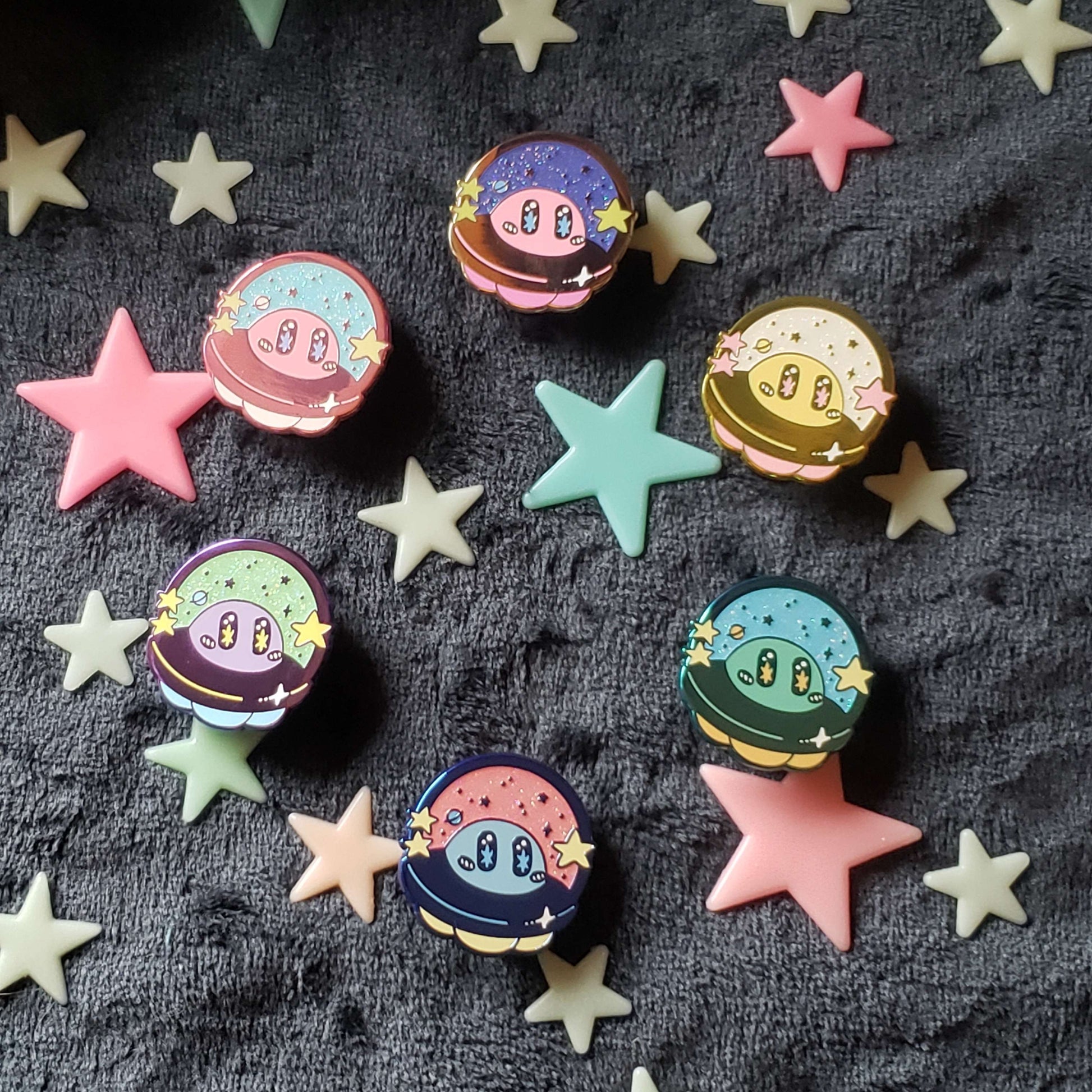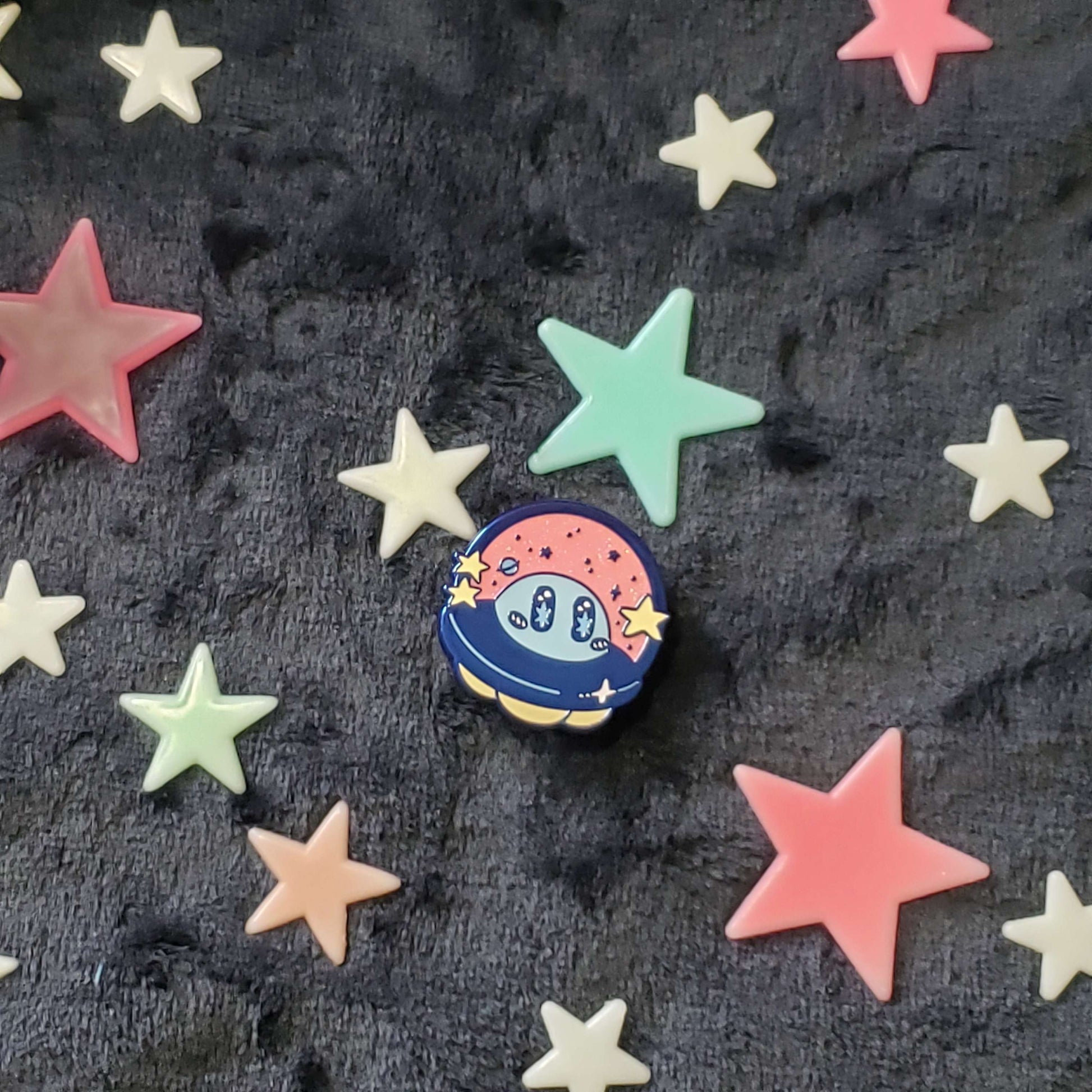 It's clear as the stars in his eyes, these pins are out of this world! These hard enamel pins have cool metal details and glitter filled skies!