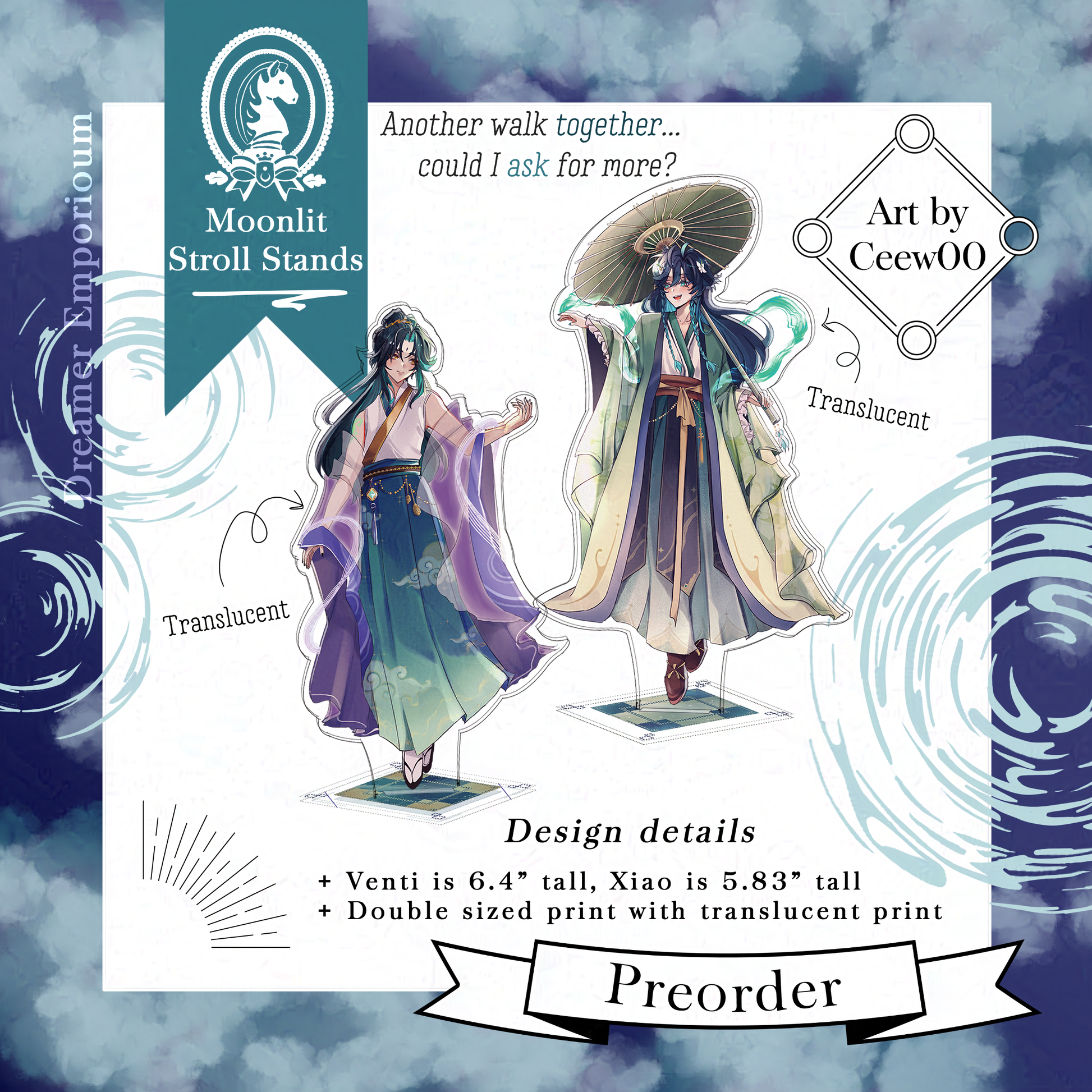 - Big standee 7.625" tall background, with 5.75" to 6.29" approx standee figure featuring both Xiao and Venti, and the base.