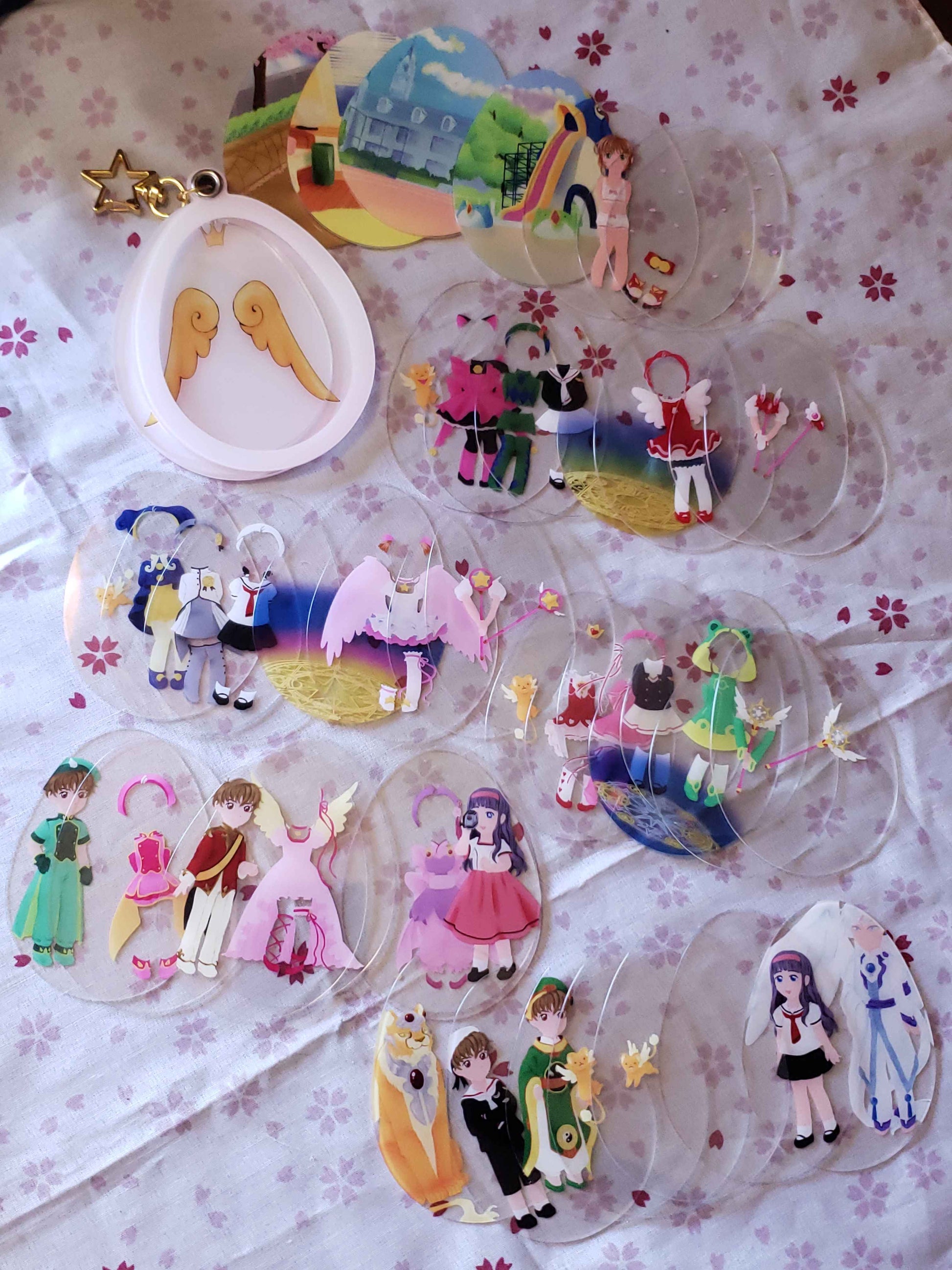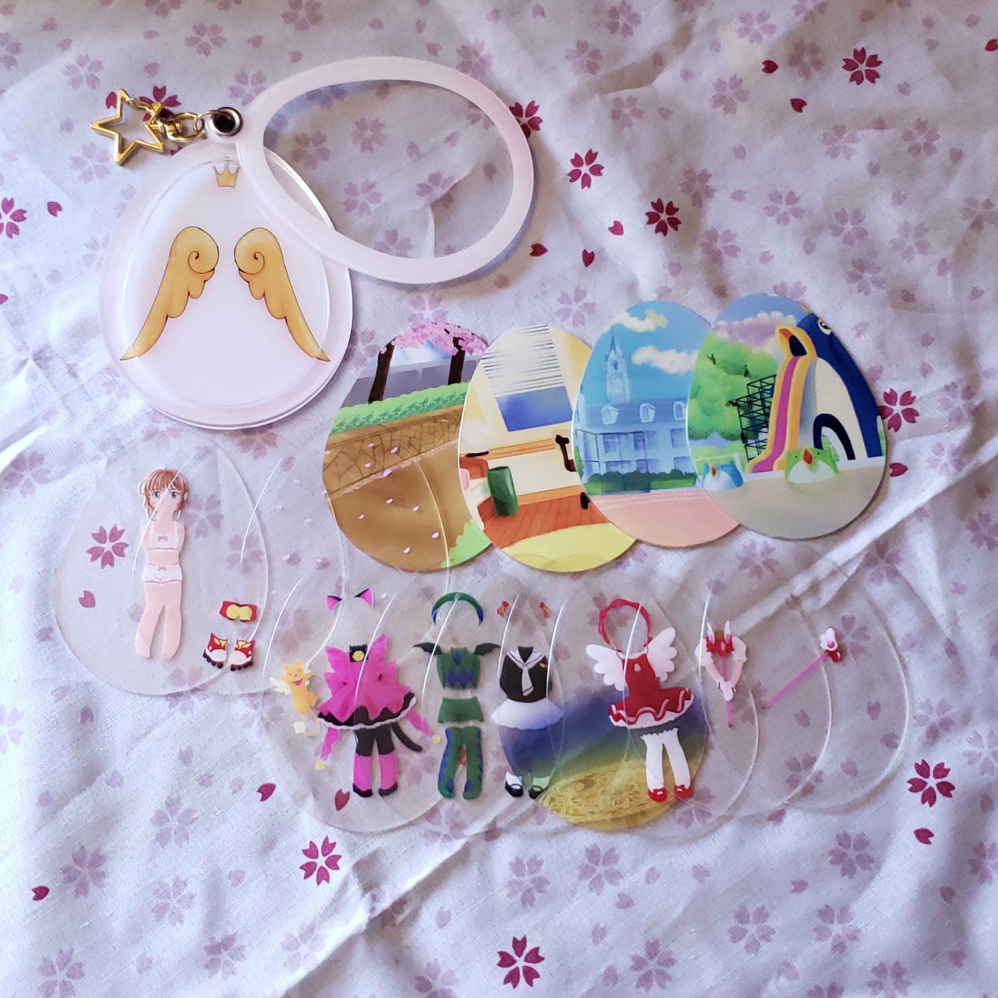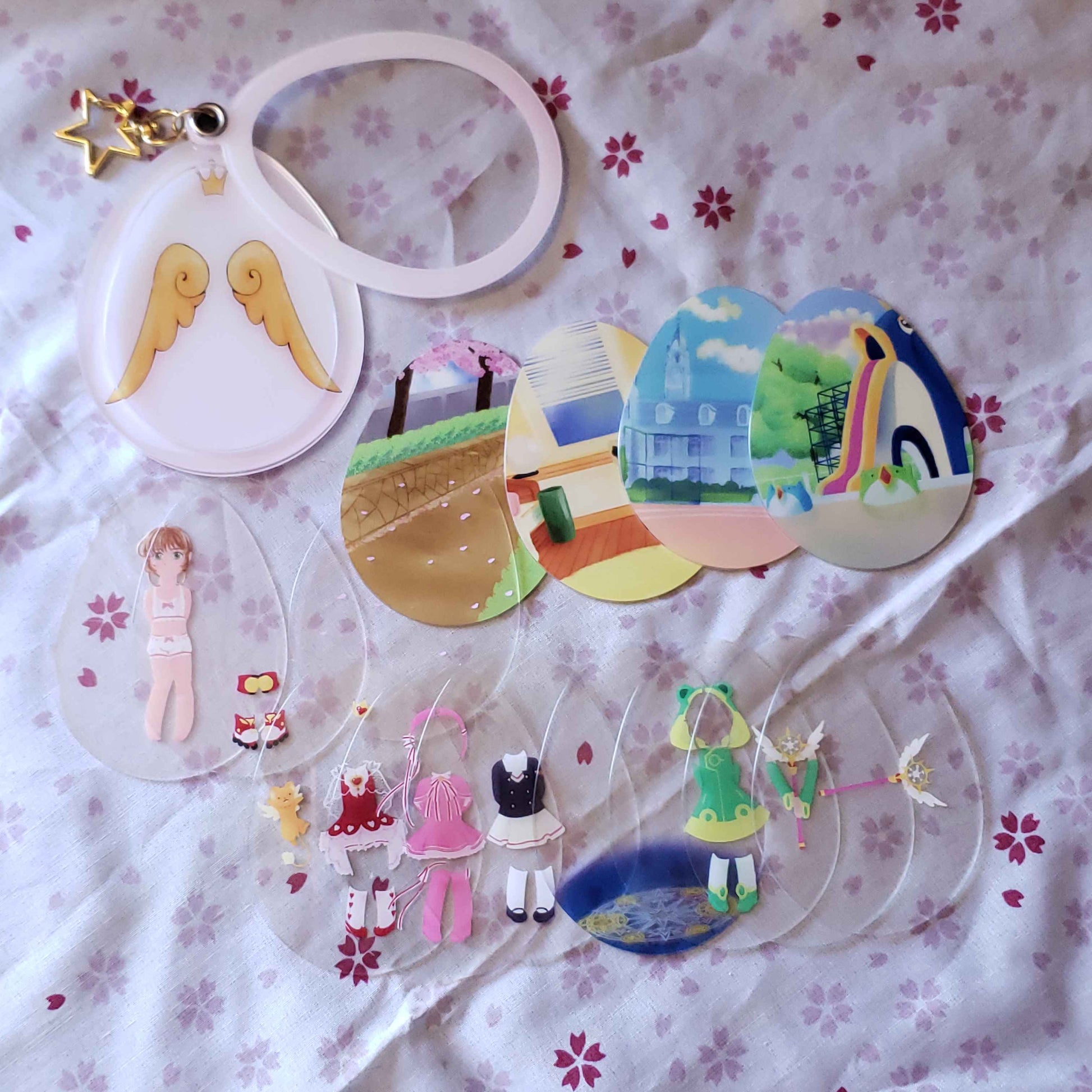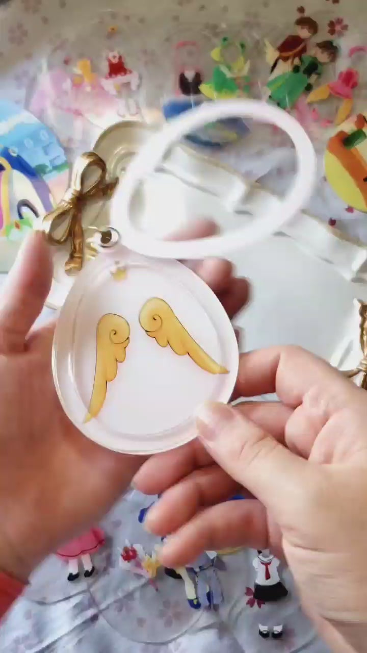 Charm that holds the powers of wishes, Release~! This acrylic charm is an improvement on paper dolls, with an outer 'egg' shaped case, and thin plastic layers that let you decide the background, and which outfits and effects Sakura is dressed up with!