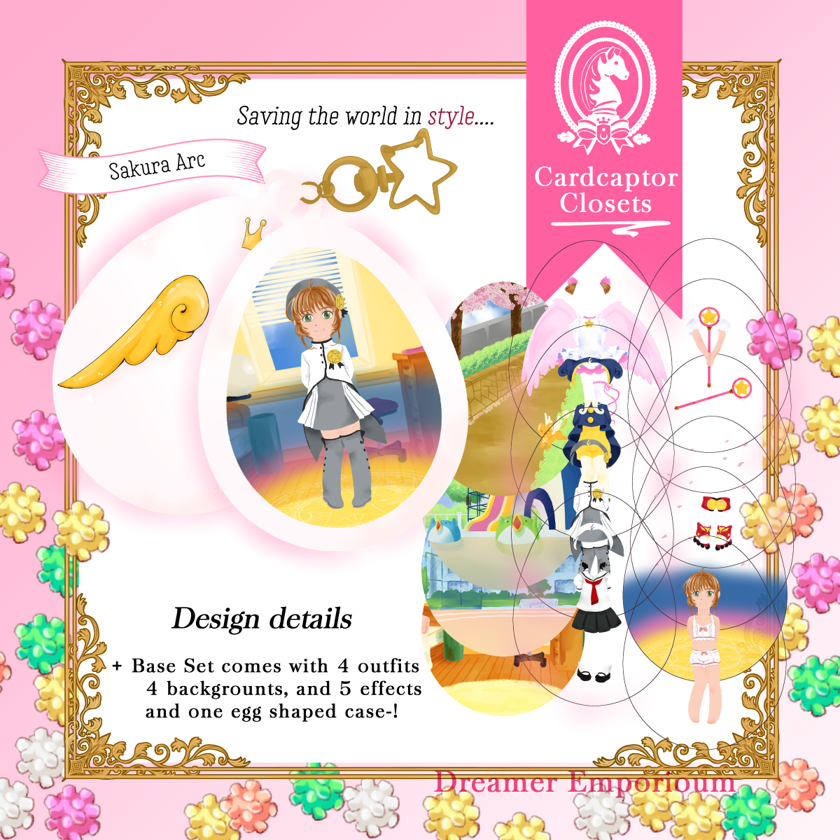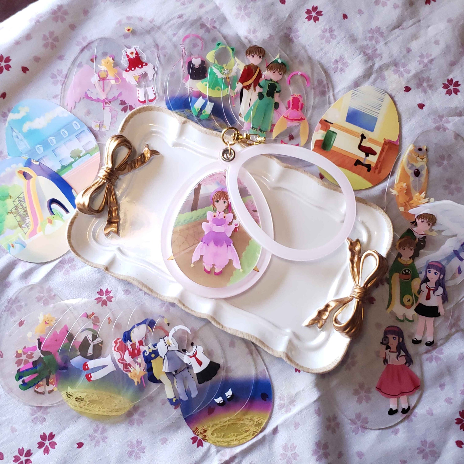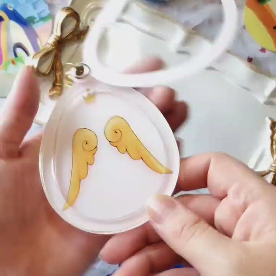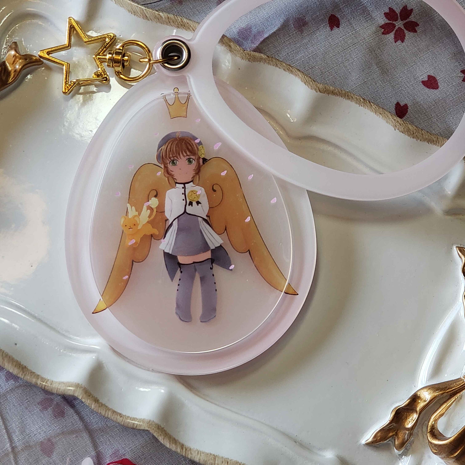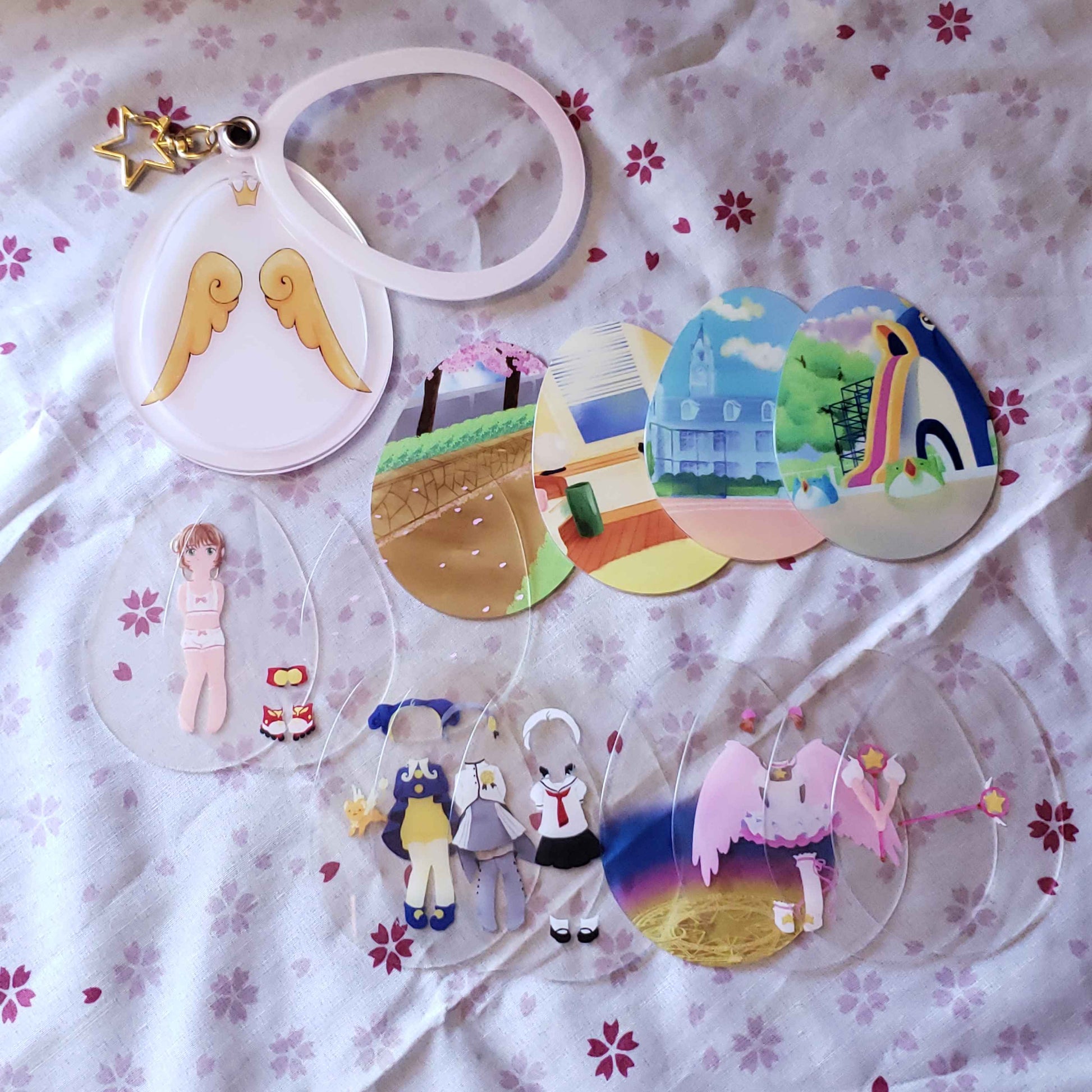Charm that holds the powers of wishes, Release~! This acrylic charm is an improvement on paper dolls, with an outer 'egg' shaped case, and thin plastic layers that let you decide the background, and which outfits and effects Sakura is dressed up with!