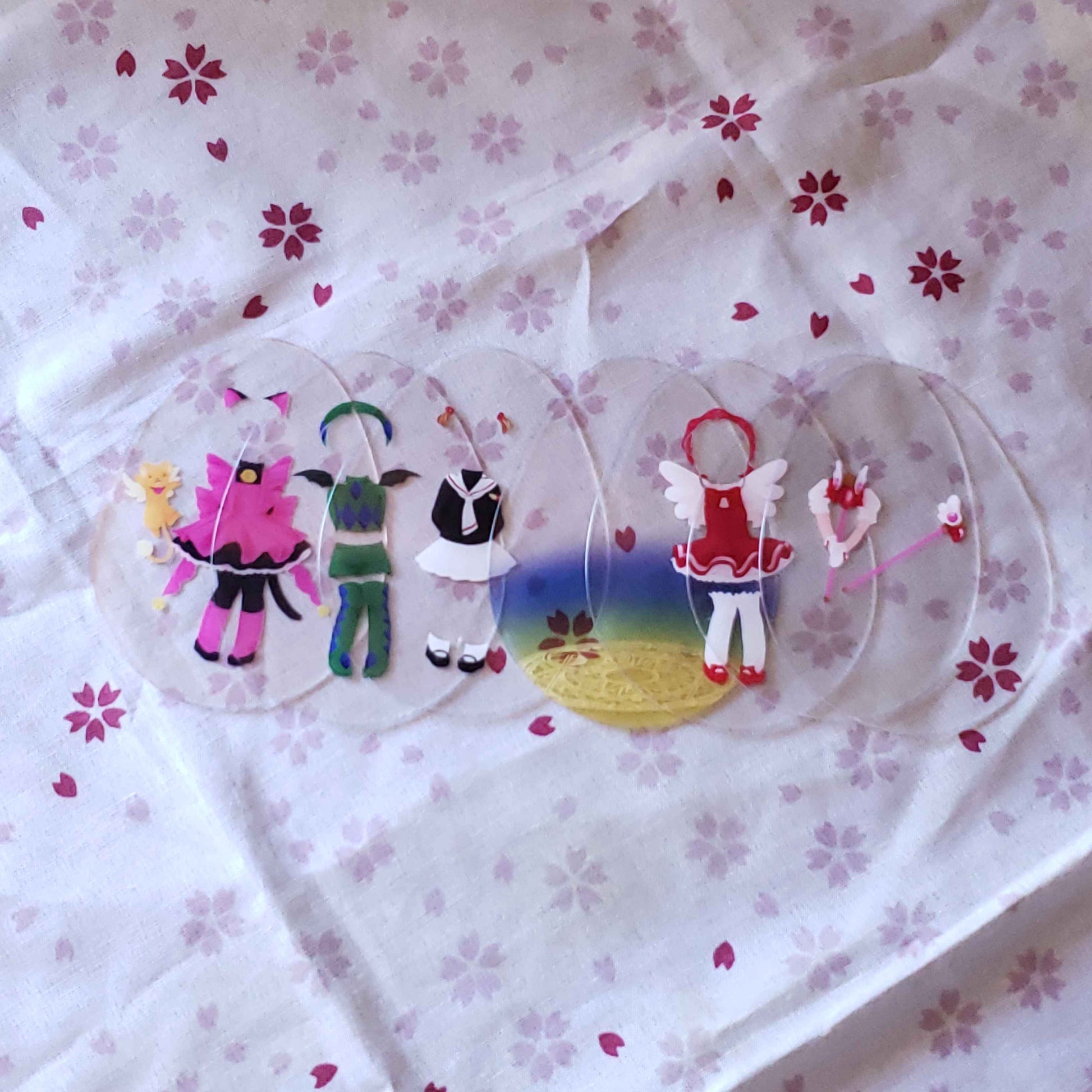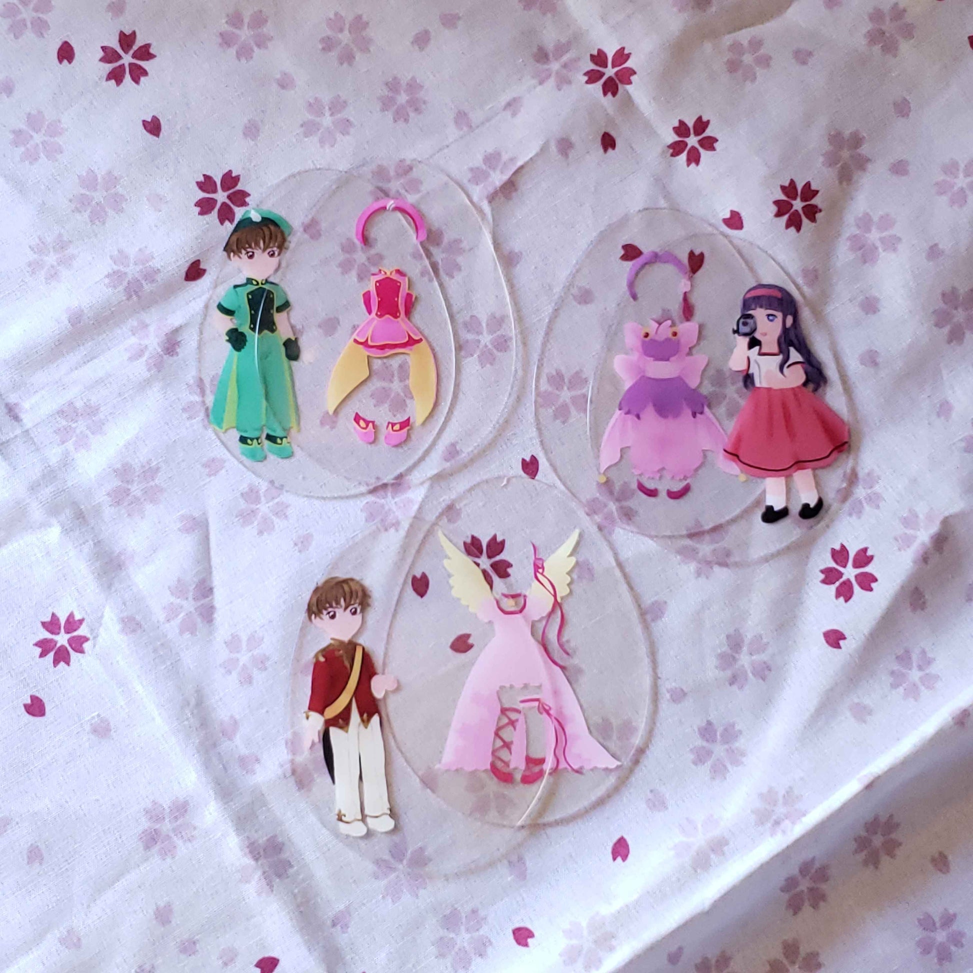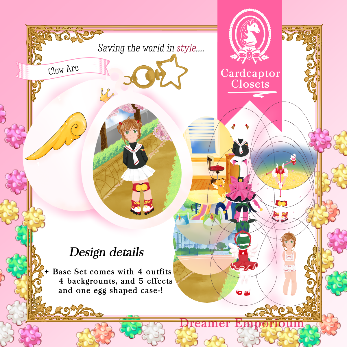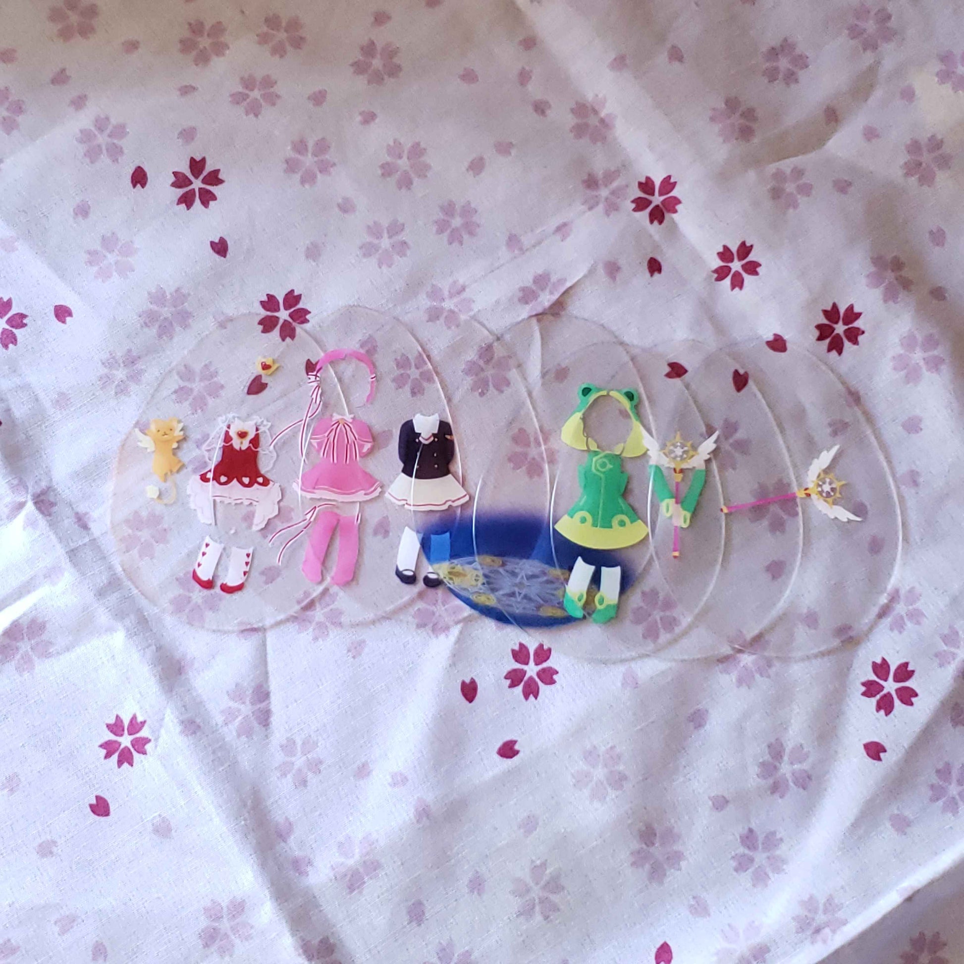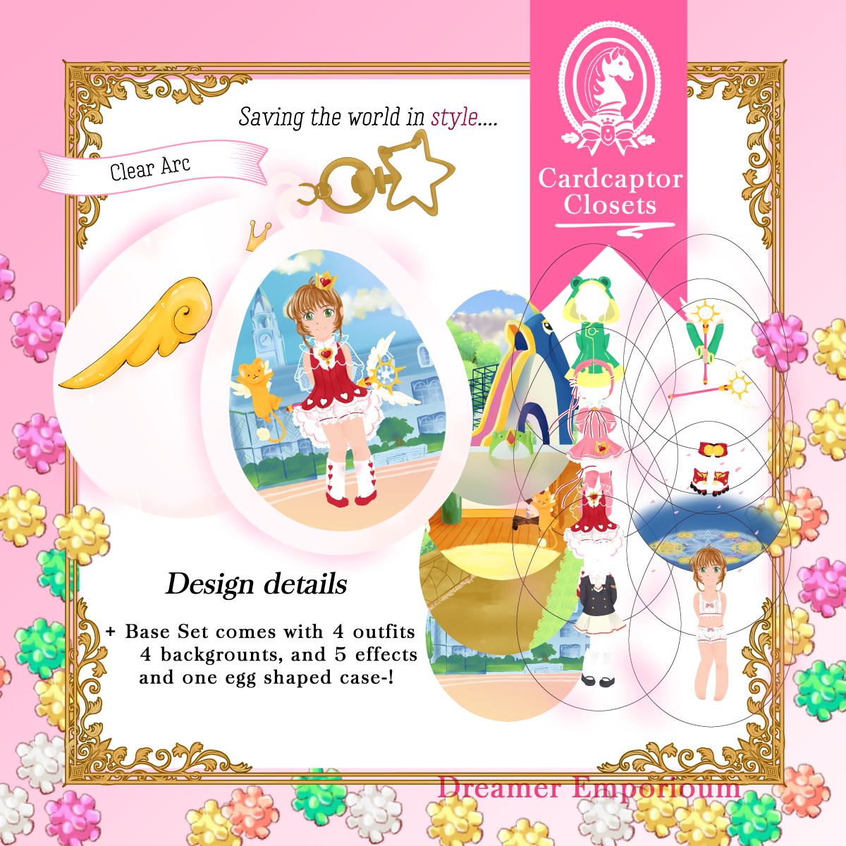Charm that holds the powers of wishes, Release~! This acrylic charm is an improvement on paper dolls, with an outer 'egg' shaped case, and thin plastic layers that let you decide the background, and which outfits and effects Sakura is dressed up with!