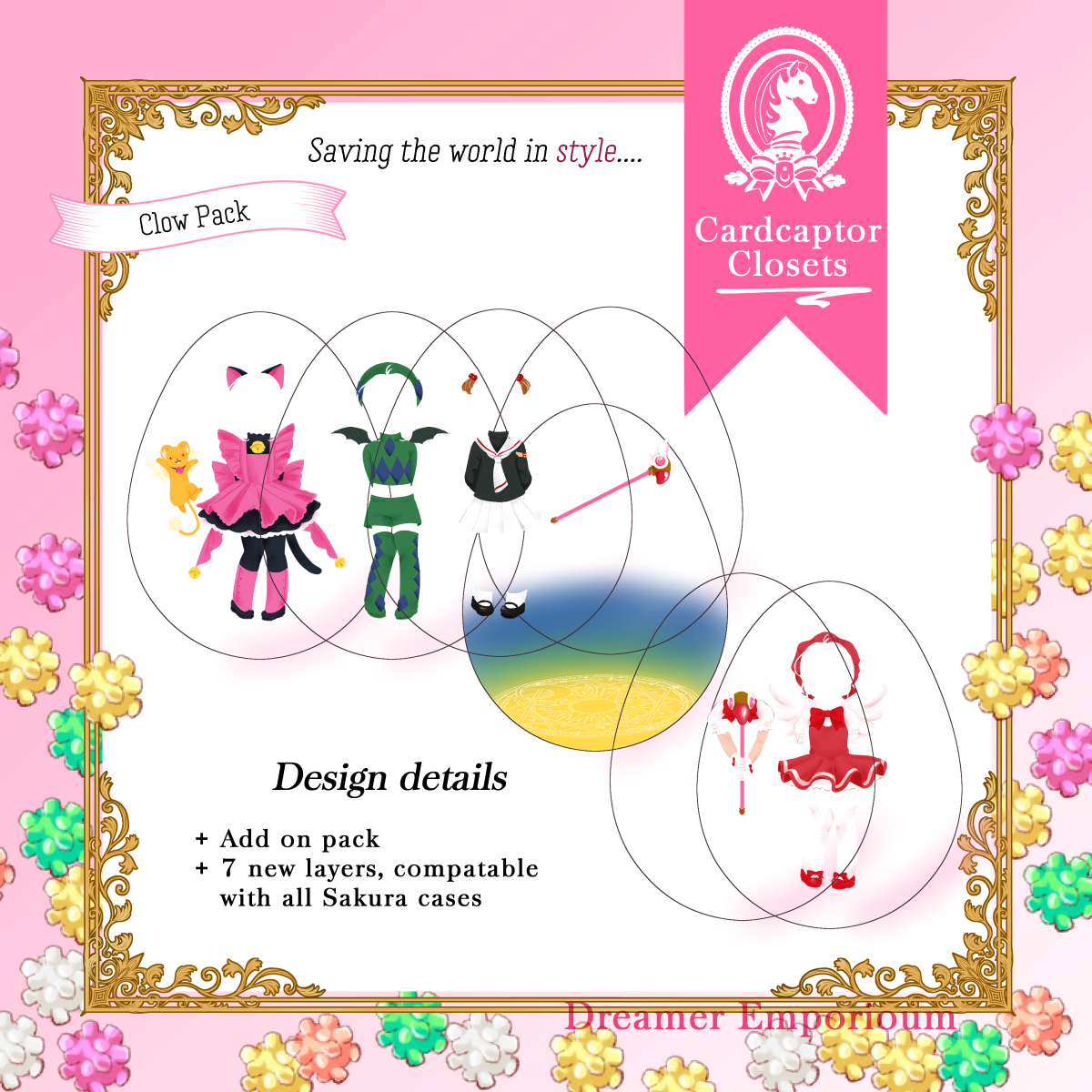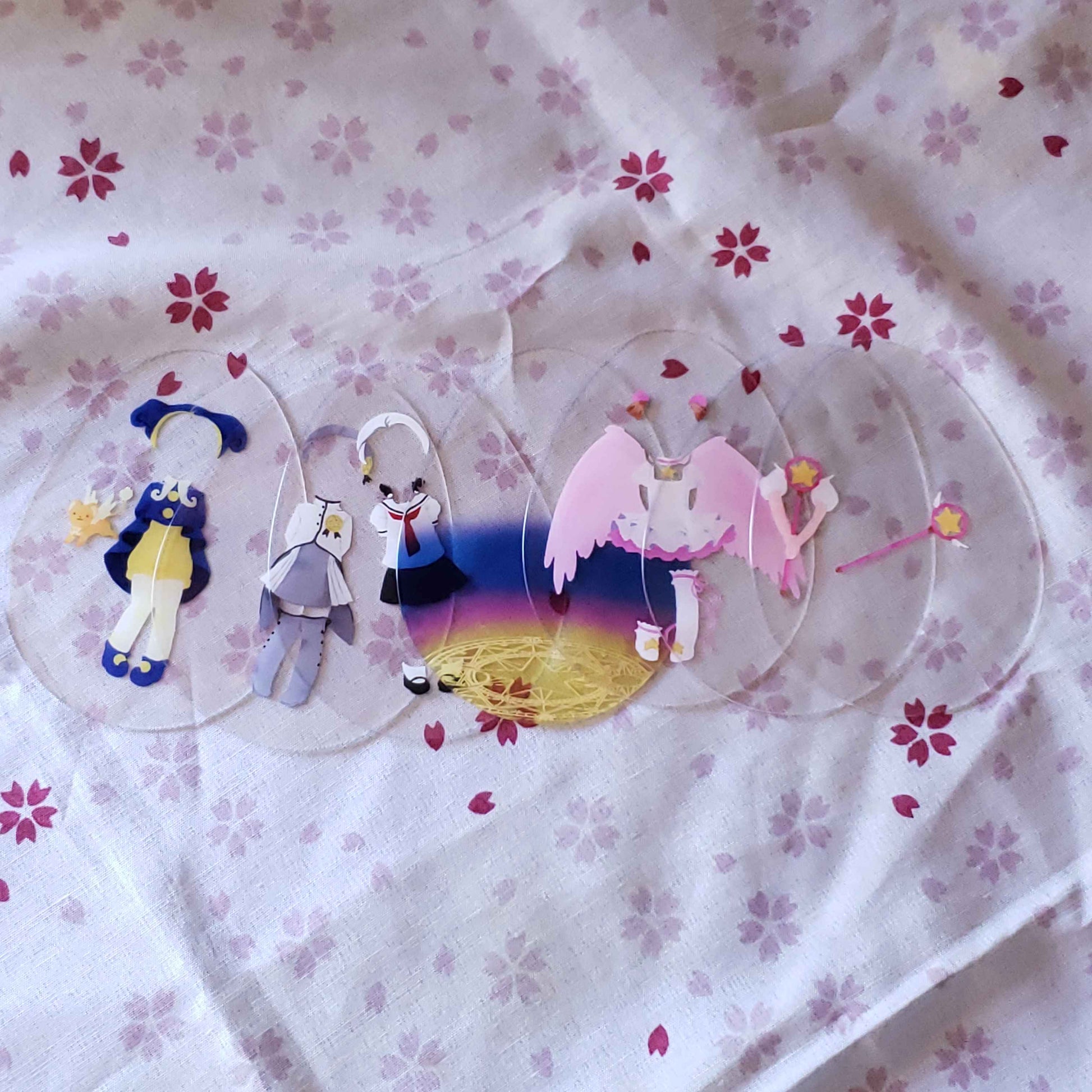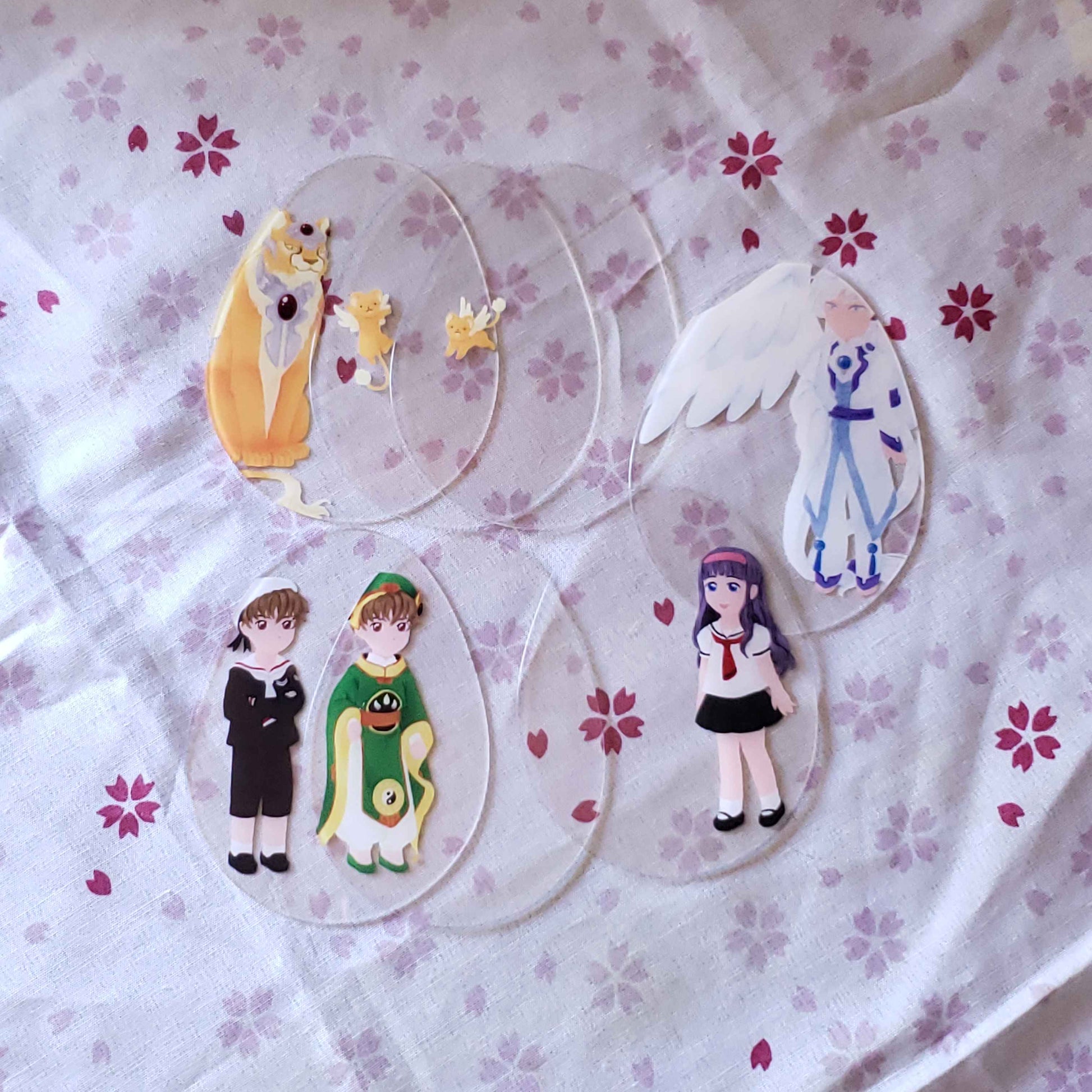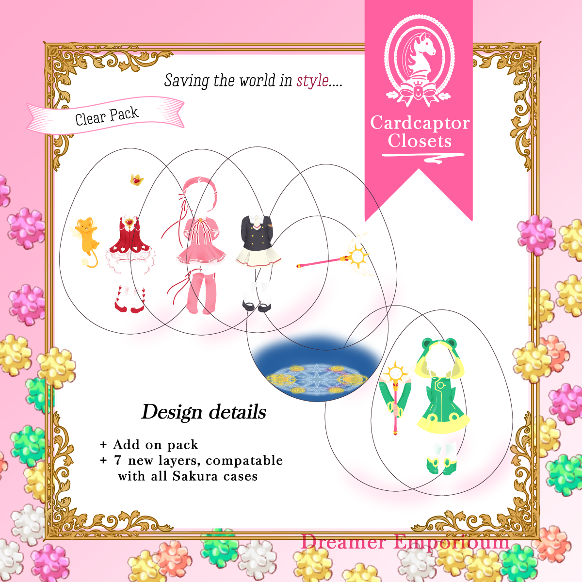 Charm that holds the powers of wishes, Release~! This acrylic charm is an improvement on paper dolls, with an outer 'egg' shaped case, and thin plastic layers that let you decide the background, and which outfits and effects Sakura is dressed up with!