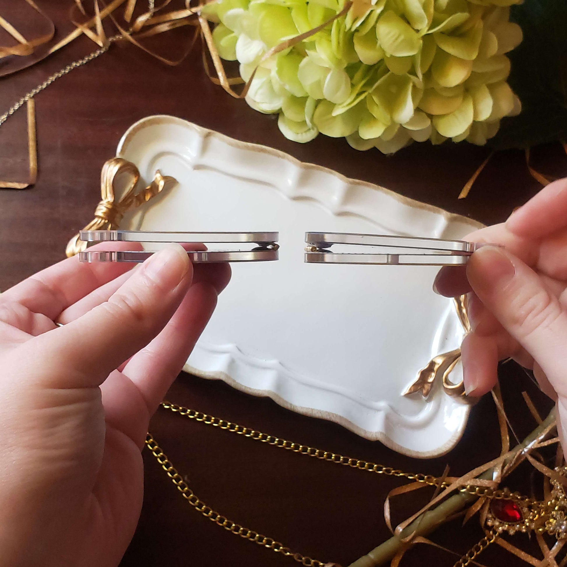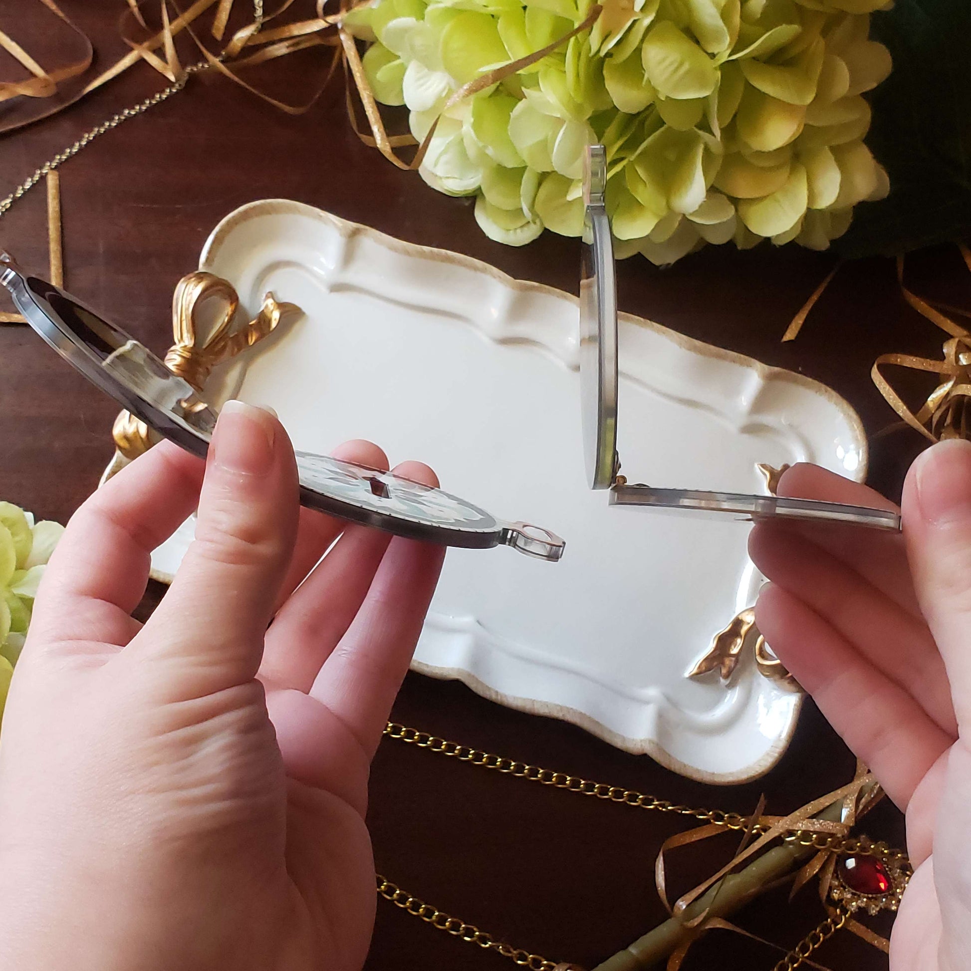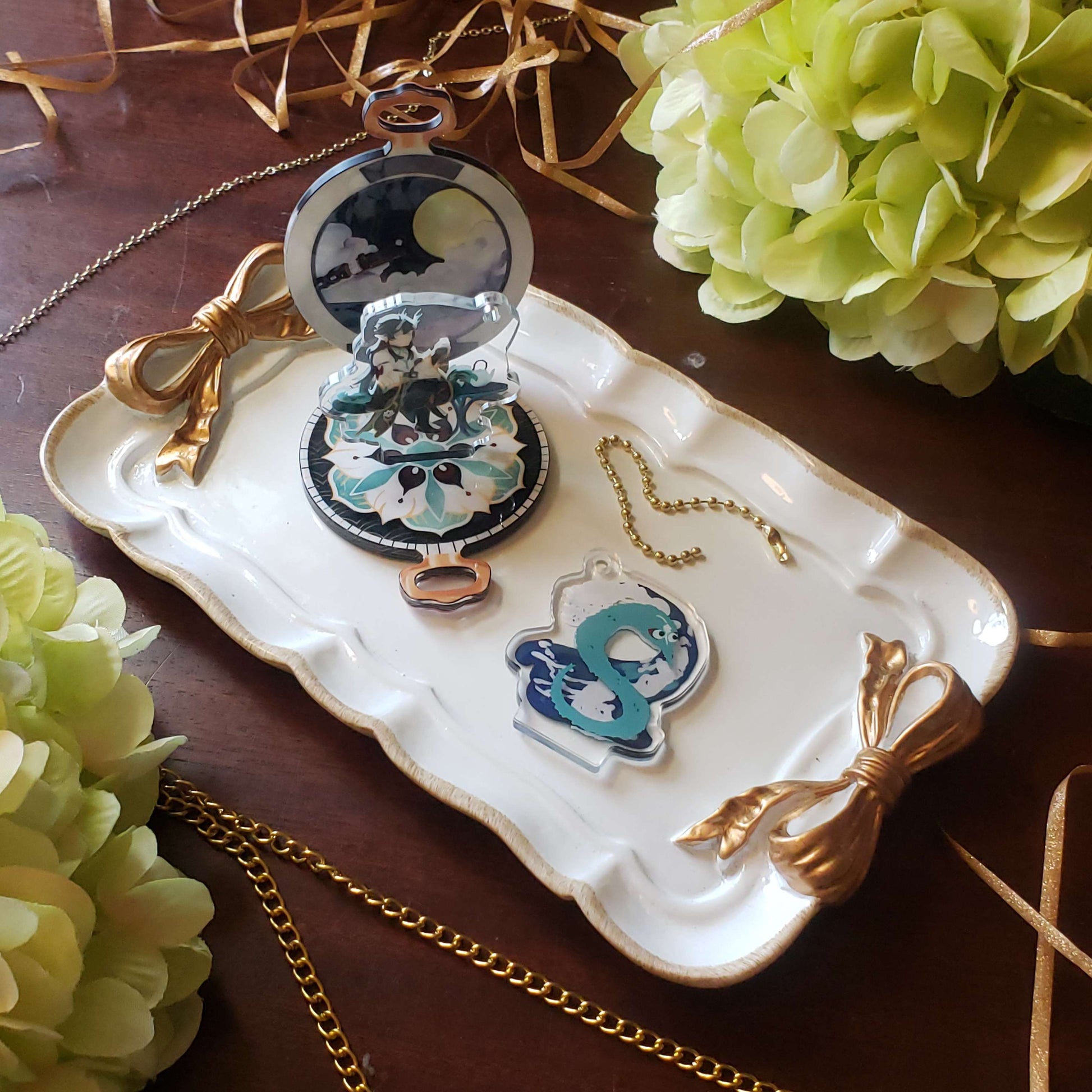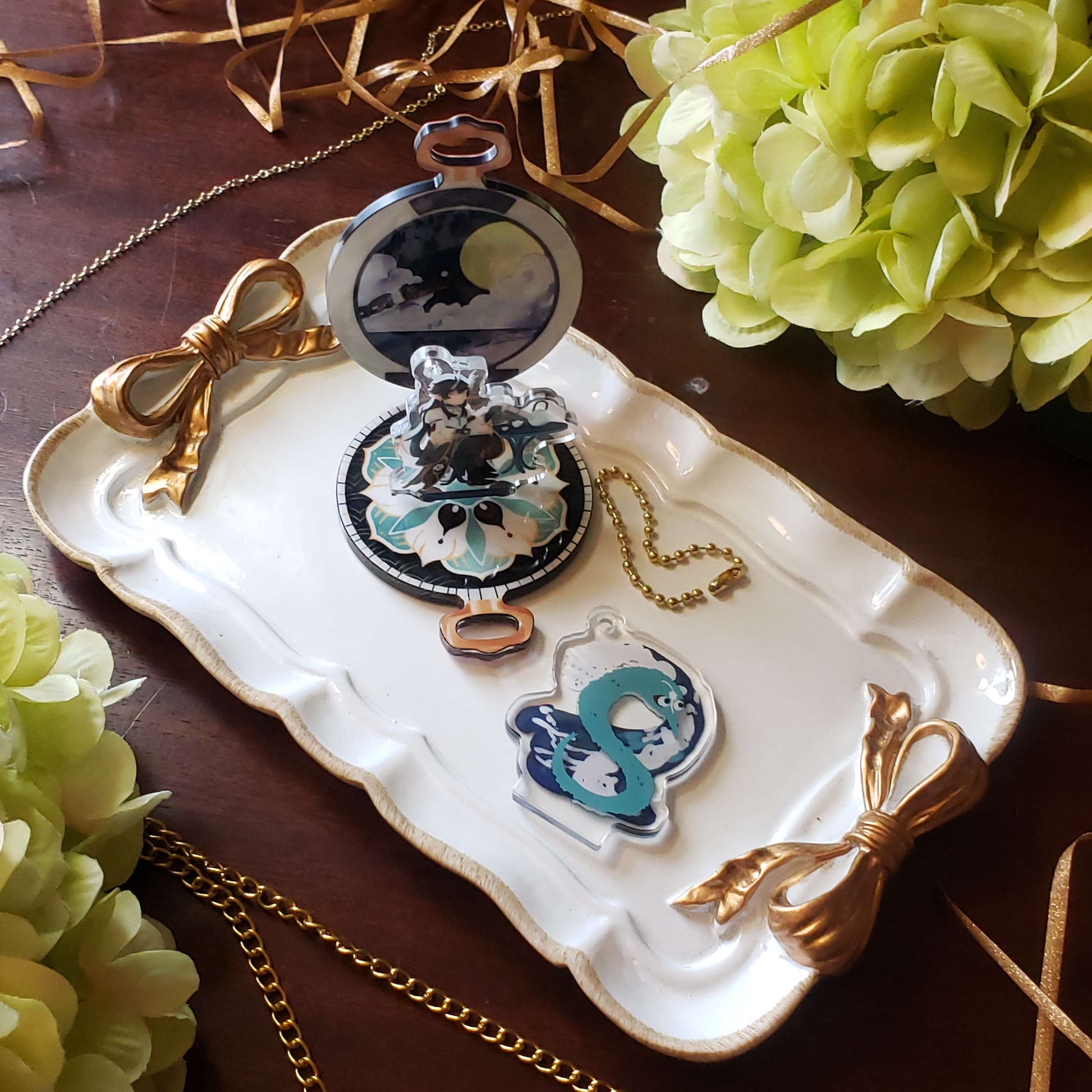 - Gold holo foil and 2 layer print adds depth to each piece-! Comes with a gold bean chain so you can carry both the watch, and the standee charms with you!