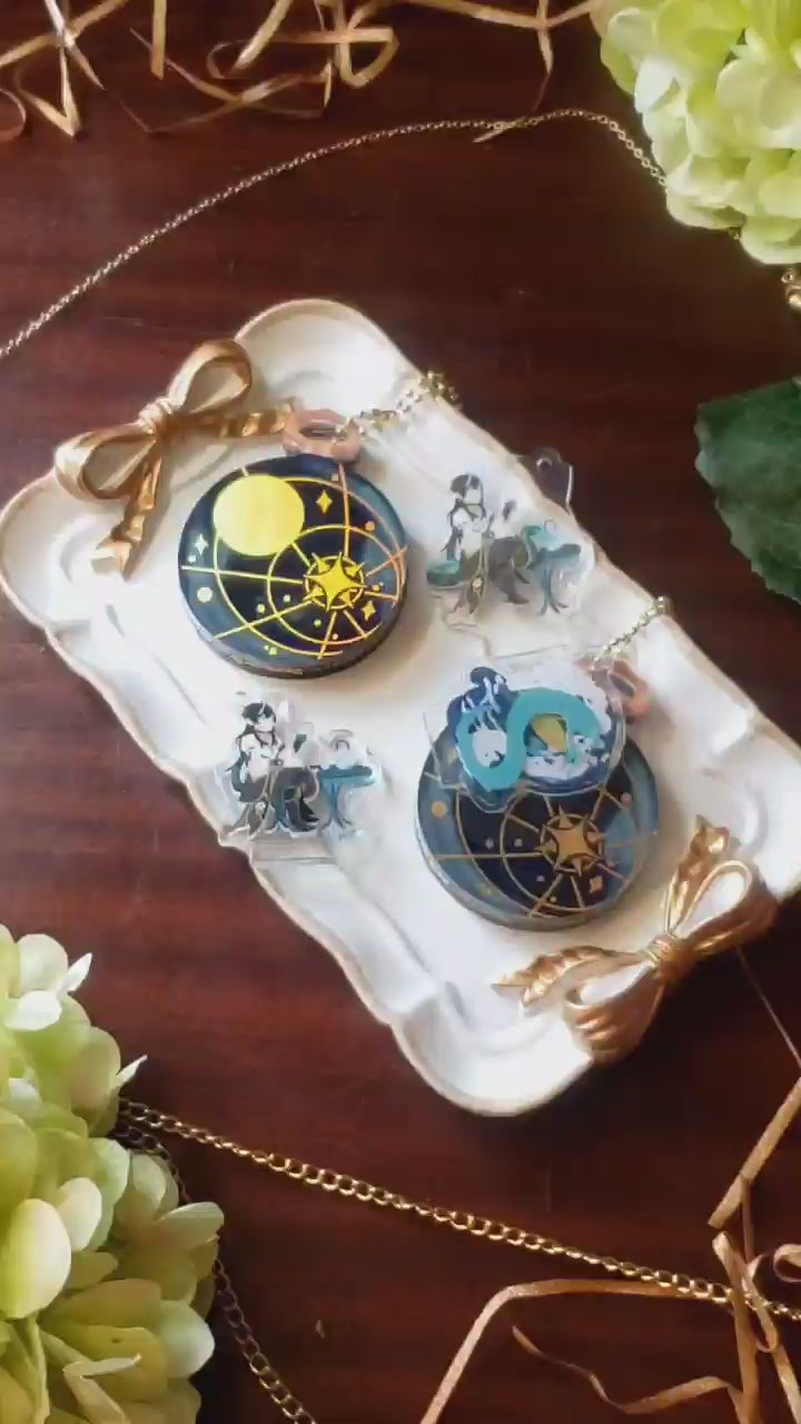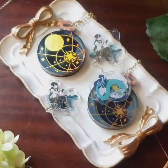 The moon is up, raise your cup, to times long past raised from the water~ This special standee charm has gold holo foil printing and a hinge to open and close the watch, and additional standee pieces.